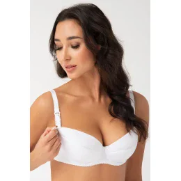 Podprsenka od Gorsenia. Model MK01 Ana. Má dráty, které prsa vhodně tvarují. Výrobek má nastavitelné popruhy bez možnosti odepnutí. Podprsenka se zapínáním na háčky a oči. Upevňovací bod: vzadu. Dvě řady svislých háčků. Čtyři stupně horizontálních háčků. Výrobek je vyroben z 90 % z polyamidu, 7 % z elastanu a 3 % z polyesteru. Výrobek pro ženy. Těhotenské oblečení. Výhody produktu: hladké krmení.