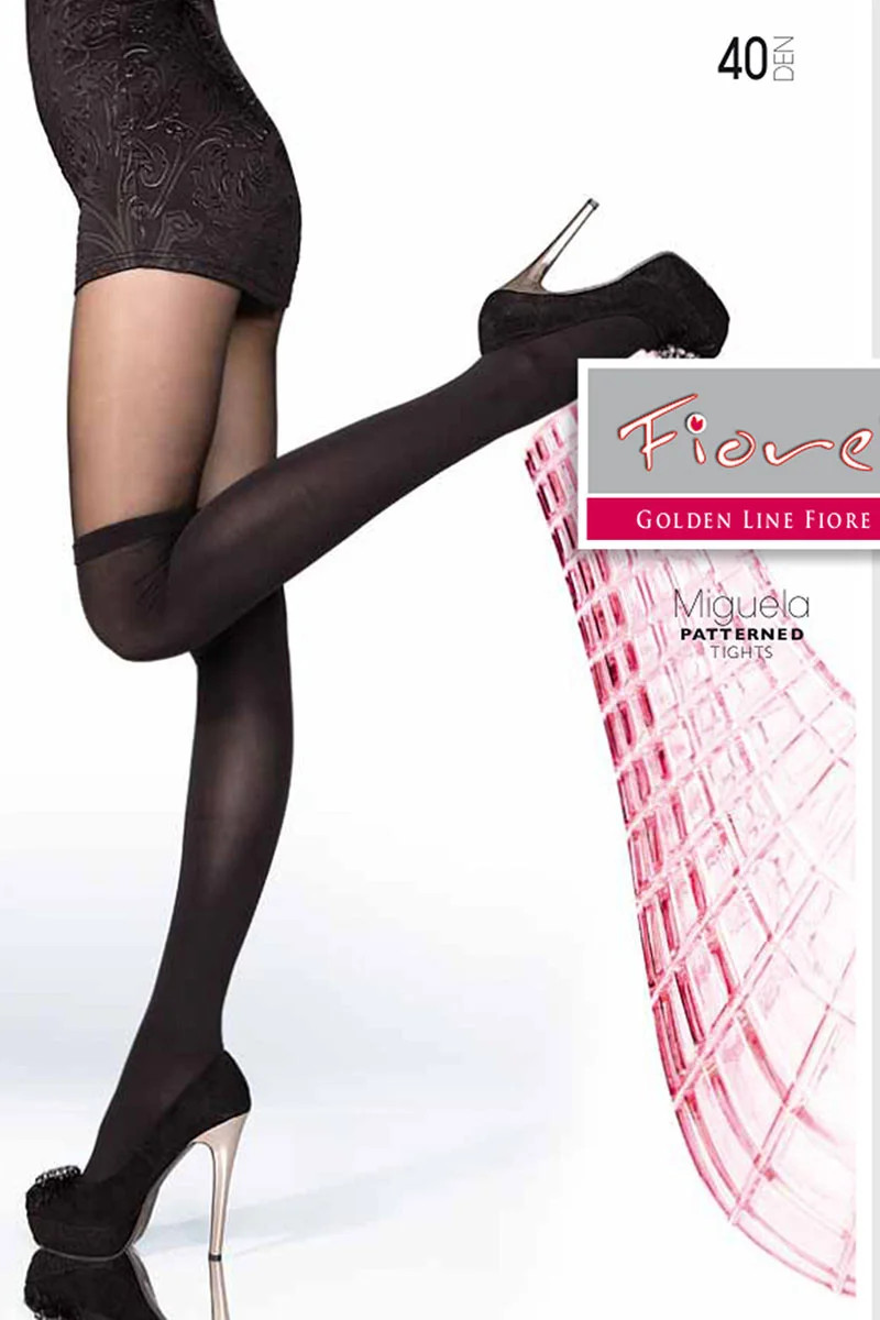 Punčochové zboží značky Fiore. Miguela 40 den model. Výrobek je vyroben z 87 % z polyamidu, 12 % z elastanu a 1 % z bavlny. Výrobek pro ženy. Tloušťka: 40 DEN. Výhody produktu: sexy imitace punčoch. Žádné označené prsty.