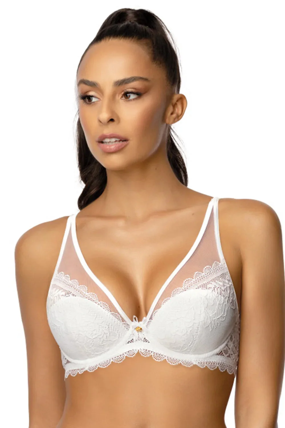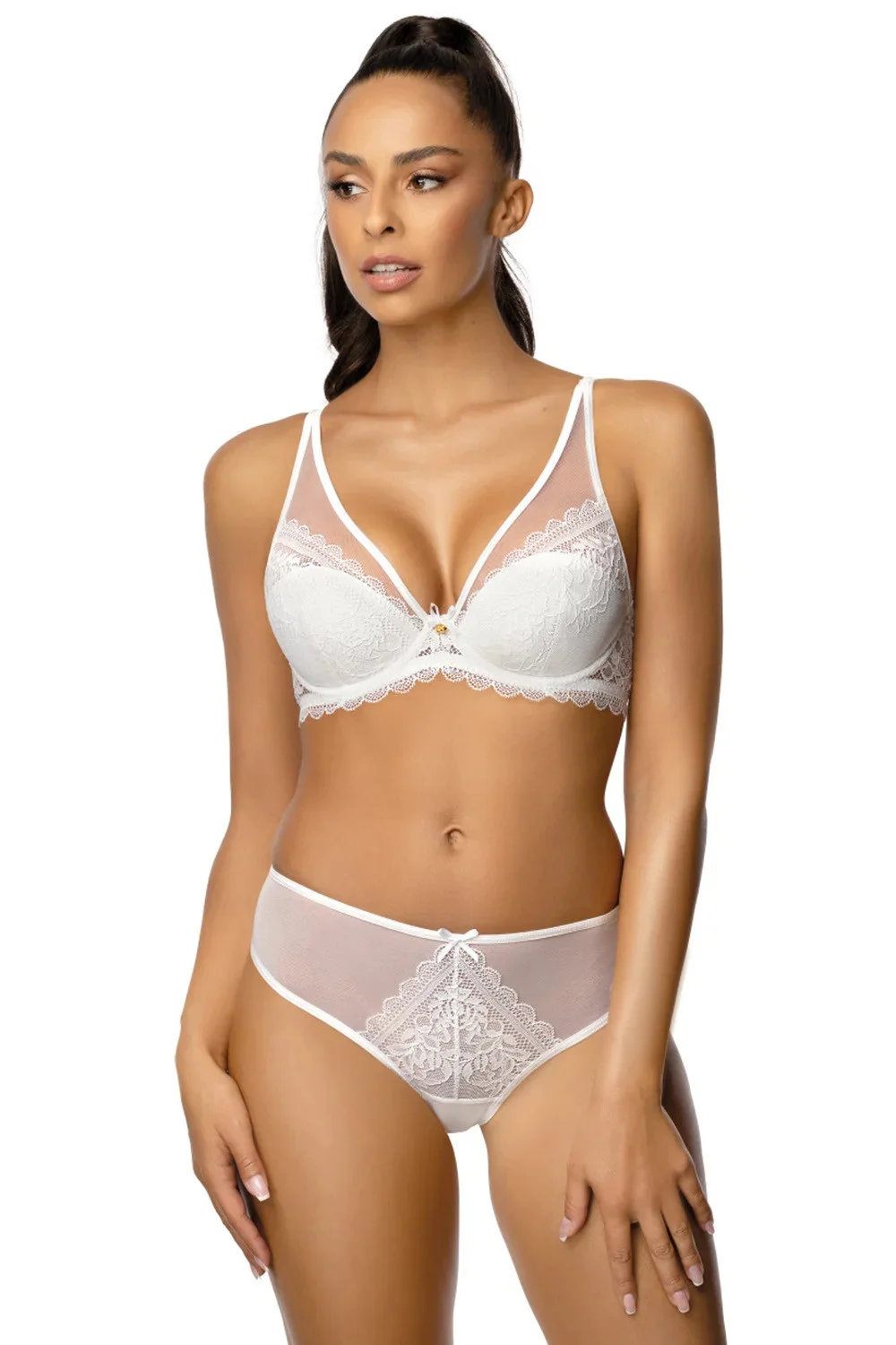 Podprsenka značky Mat. Model 0198/11 Estelle. Má dráty, které prsa vhodně tvarují. Svislé velrybí kosti zasazené po stranách. Výrobek má nastavitelné popruhy bez možnosti odepnutí. Kovové háčky na popruh. Podprsenka se zapínáním na háčky a oči. Upevňovací bod: vzadu. Dvě řady svislých háčků. Tři stupně horizontálních háčků. Výrobek je vyroben ze 42 % polyamidu, 22 % bavlny, 19 % polyuretanu, 15 % polyesteru a 2 % elastanu. Výrobek pro ženy. Výrobek má kapsy na vložky.