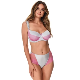Podprsenka od Kostar. MM61 Allie model. Má dráty, které prsa vhodně tvarují. Svislé velrybí kosti zasazené po stranách. Výrobek má nastavitelné popruhy bez možnosti odepnutí. Plastové háčky na popruh. Podprsenka se zapínáním na háčky a oči. Upevňovací bod: vzadu. Výrobek je vyroben ze 60 % z bavlny, 30 % z polyamidu a 10 % z elastanu. Spodní prádlo má odnímatelný košíček. Výrobek pro ženy. Těhotenské oblečení.
