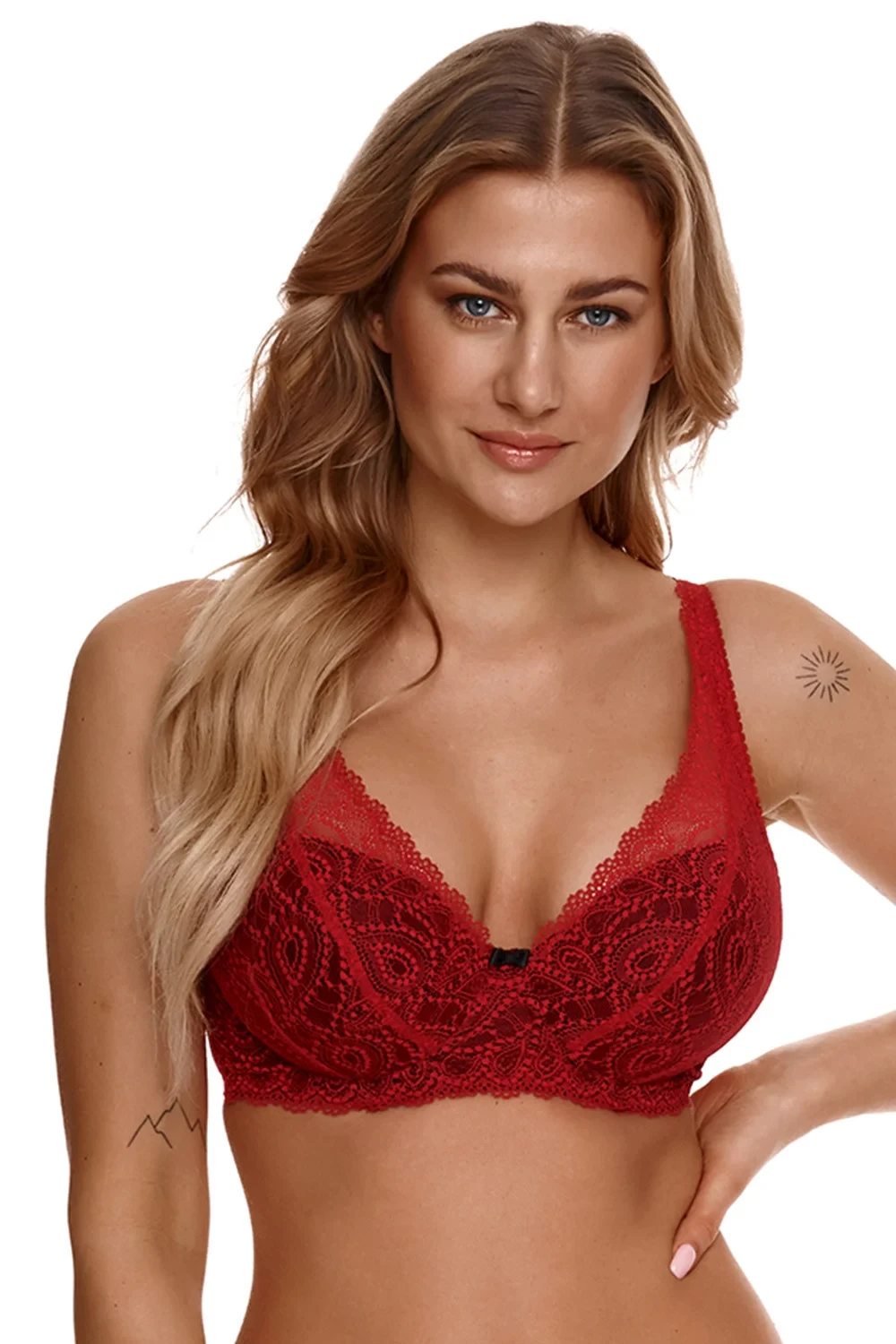 Biustonosz marki Lupoline. Model 2311. Posiada druty, które podpierają piersi odpowiednio je kształtując. Fiszbiny pionowe osadzone na bokach. Produkt posiada regulowane ramiączka bez możliwości ich odpięcia. Haczyki do ramiączek metalowe. Biustonosz zapinany na haftki. Miejsce zapięcia: tył. Dwa rzędy haftek pionowych. Trzy stopnie haftek poziomych. Produkt został wykonany z 85% poliamid, 15% elastan. Produkt damski. Produkt posiada profilowaną miseczkę.