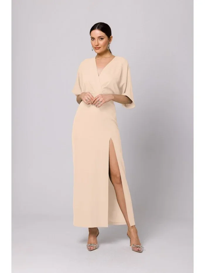 95 % polyester 5 % elastan Milujeme dlouhou siluetu, vysoký rozparek na nohavicích a kimonový vzor rukávů těchto maxi šatů. PODROBNOSTI O PRODUKTU: maxi šaty z tkané látky s vysokým rozparkem na nohou výstřih do V kimonový vršek krátké rukávy skrytý boční zip bez podšívky Naše modelka je vysoká 175 cm a nosí velikost S