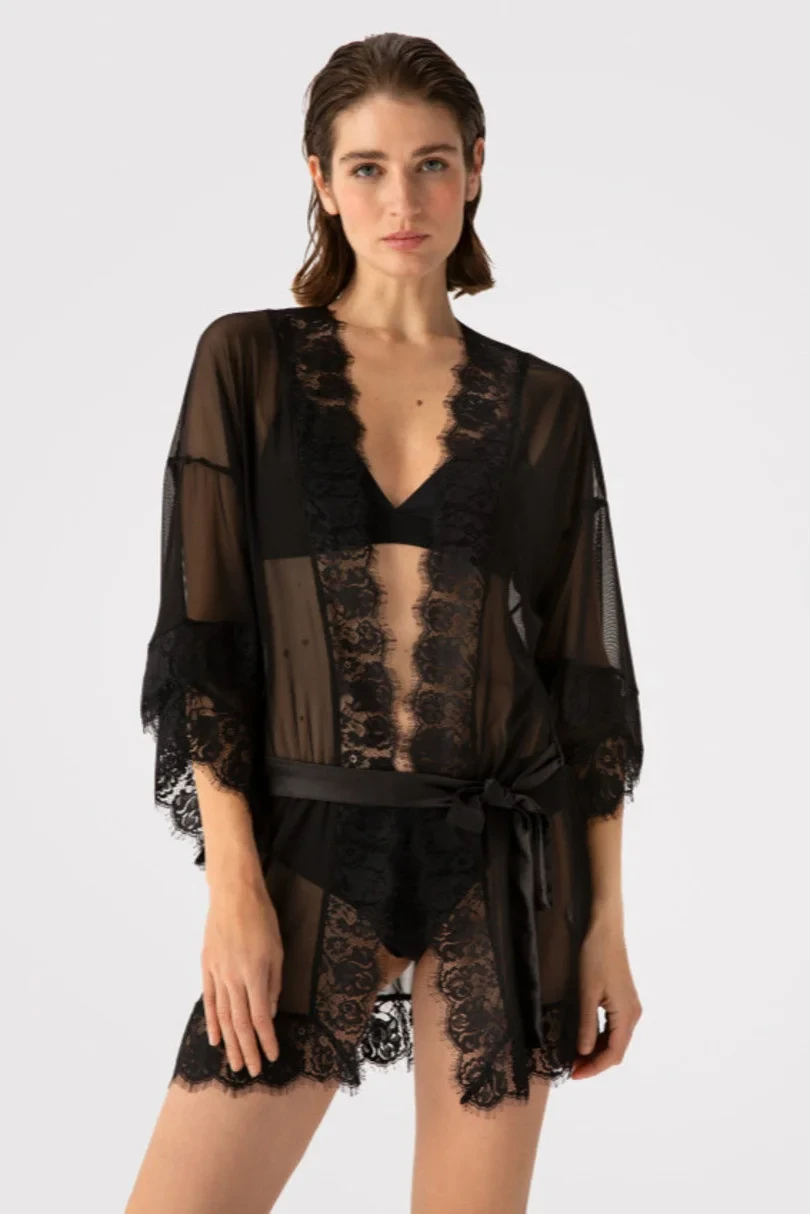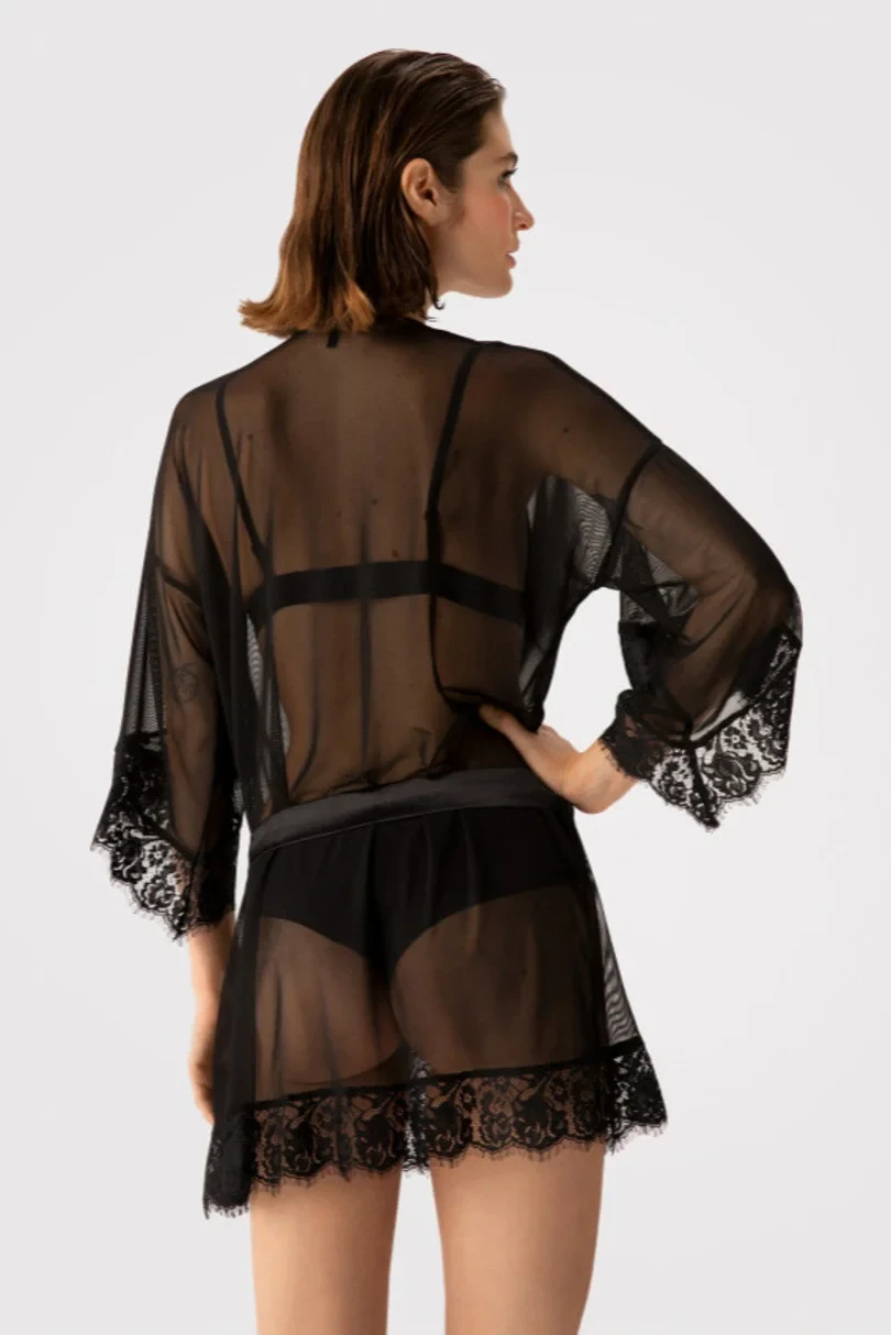 Elegantní negližé z průhledné tylové látky, v pase svázané saténovou šerpou s ozdobnou třepenou krajkou. Spuštěné rukávy volně splývají podél paží a odhalují zápěstí.