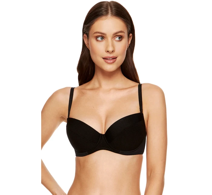 Biustonosz marki Gorteks. Model Andrea/B1. Posiada druty, które podpierają piersi odpowiednio je kształtując. Fiszbiny pionowe osadzone na bokach. Produkt posiada regulowane ramiączka z możliwością ich odpięcia. Haczyki do ramiączek metalowe. Biustonosz zapinany na haftki. Miejsce zapięcia: tył. Dwa rzędy haftek pionowych. Trzy stopnie haftek poziomych. Produkt został wykonany z 65% poliamid, 20% poliester, 10% bawełna, 5% elastan. Produkt damski.