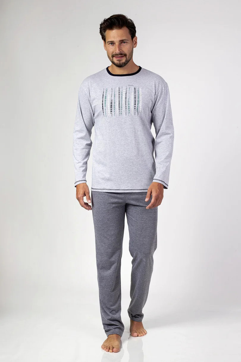 Klasické pánské pyžamo s dlouhými rukávy z kvalitní bavlny. Hladké tričko s kulatým výstřihem a potiskem na hrudi. Doplněno pevnými kalhotami s dlouhými nohavicemi.