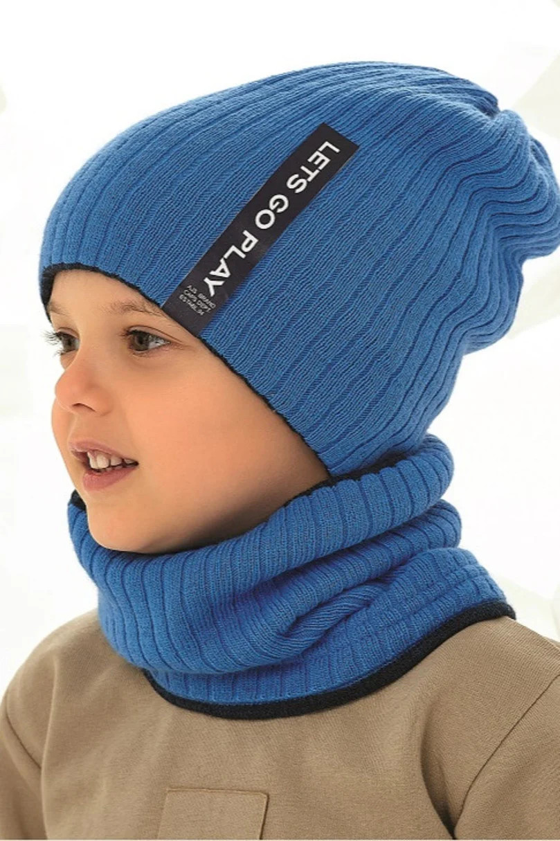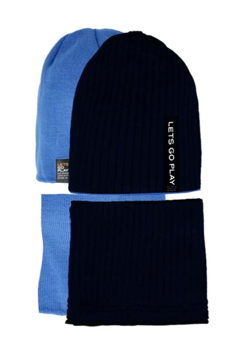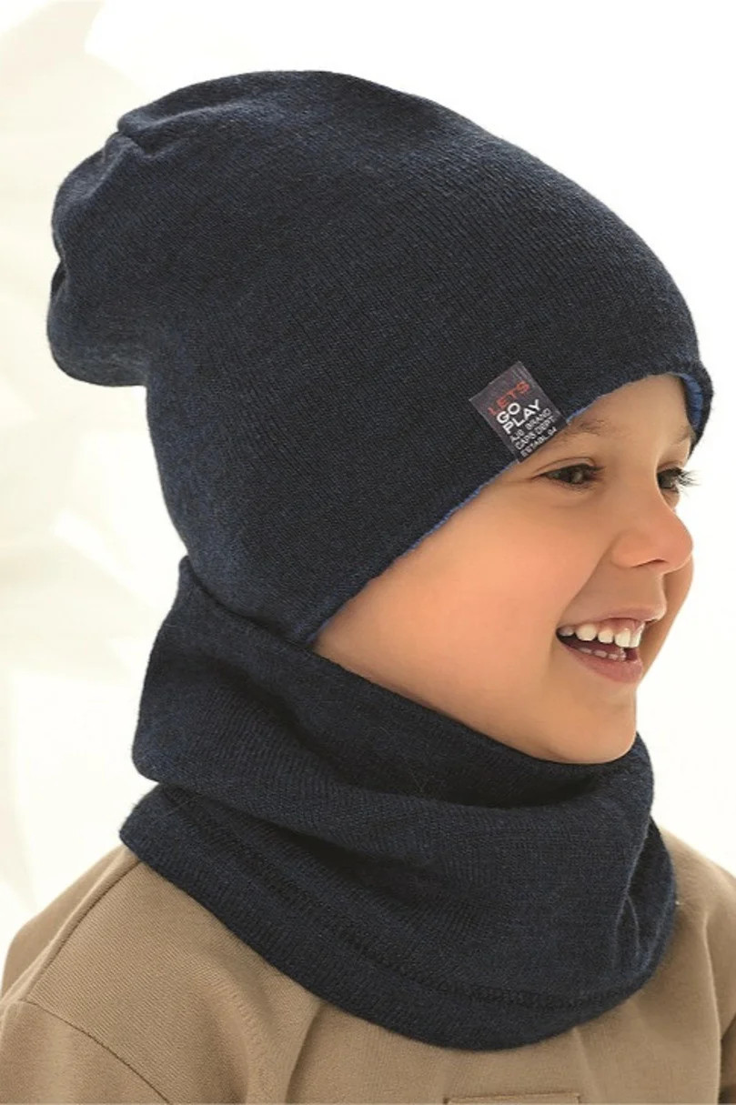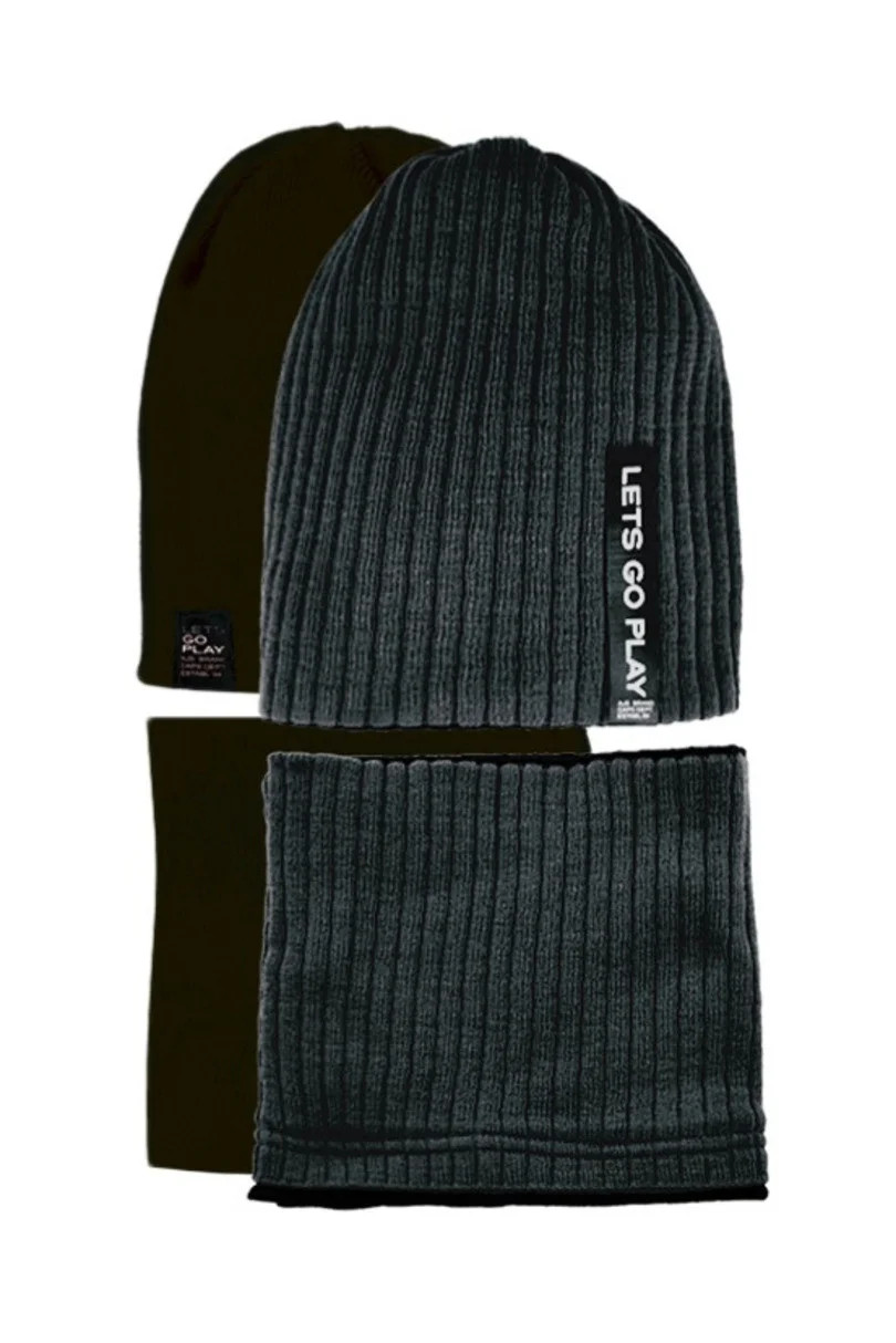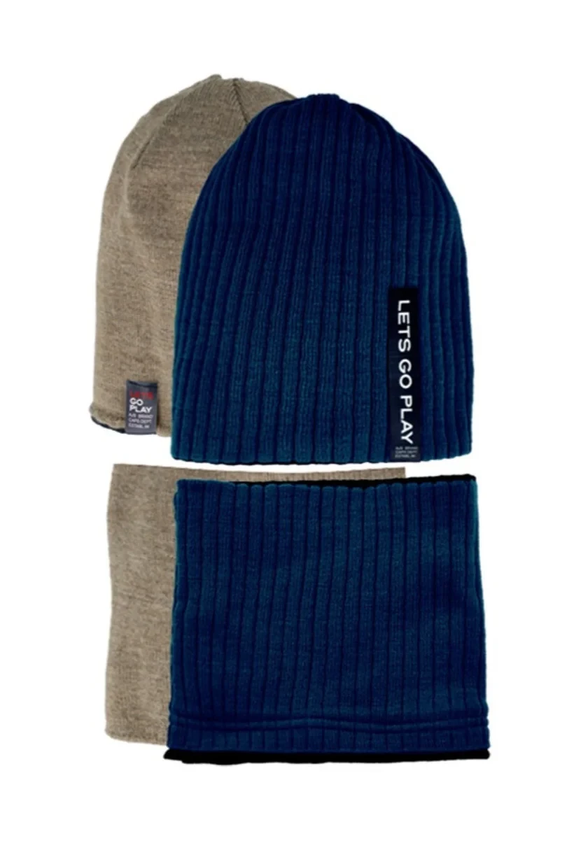 Oboustranná chlapecká souprava: čepice s kšiltem. Čepice mírně prodloužená, s nášivkami na obou stranách. Hladký kšilt, rovněž oboustranný