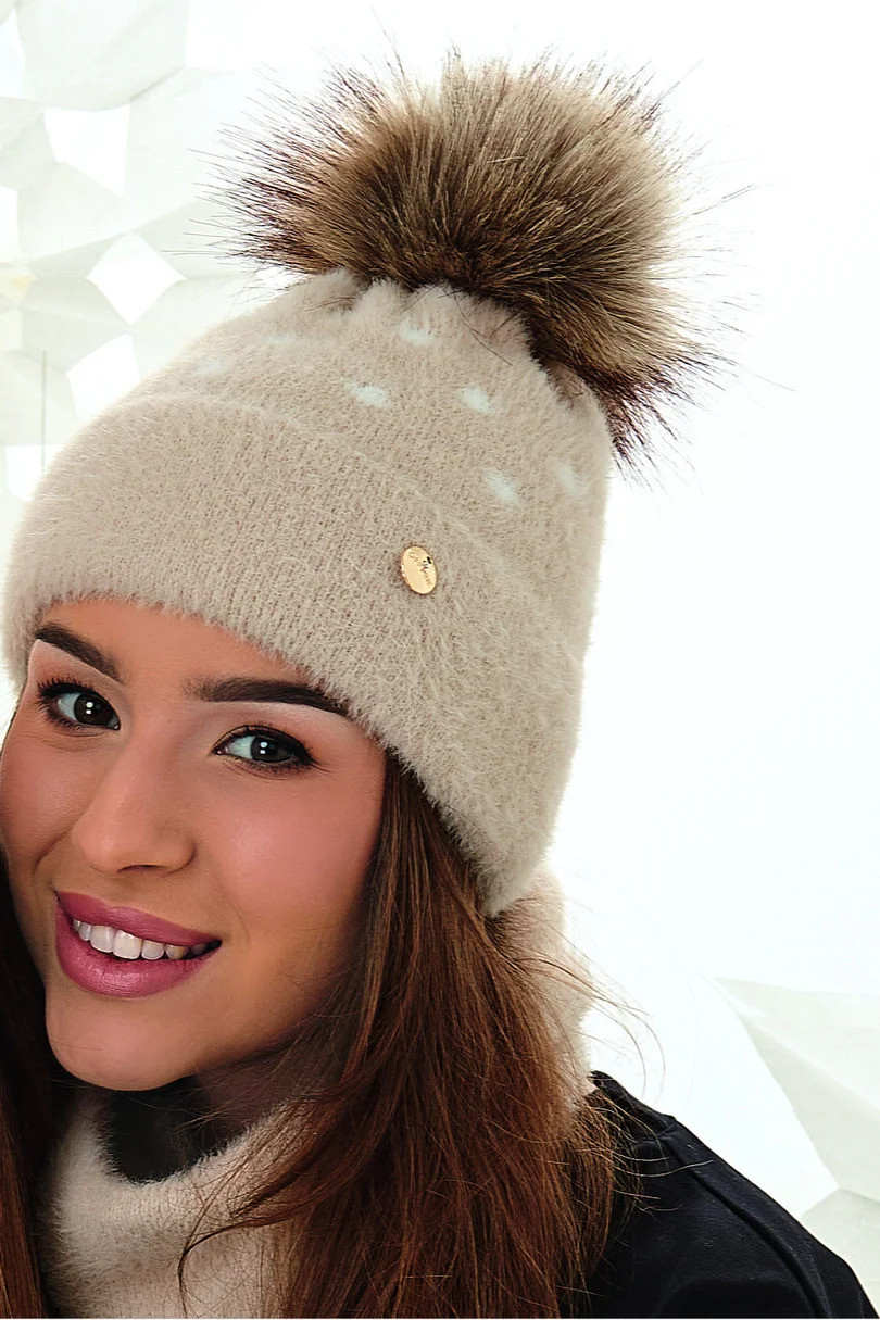 Dámská souprava: čepice a šnorchl z mimořádně příjemného na dotek a hřejivého polyamidu. Čepice a šnorchl z jedné vrstvy s ohrnutím. Čepice zdobená malou zlatou visačkou s logem firmy a zirkony.