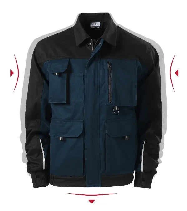 celopropínací kostěný zip s klopou záhyby na zadním dílu 8 multifunkčních kapes měchové kapsy s klopou a lištové kapsy na zip manžety rukávů z žebrového úpletu s 3 % elastanu dolní okraj stažený pruženkou v boční části kovové "D" poutko na klíče a ID karty dvojité prošití pro vyšší odolnost retroreflexní prvky