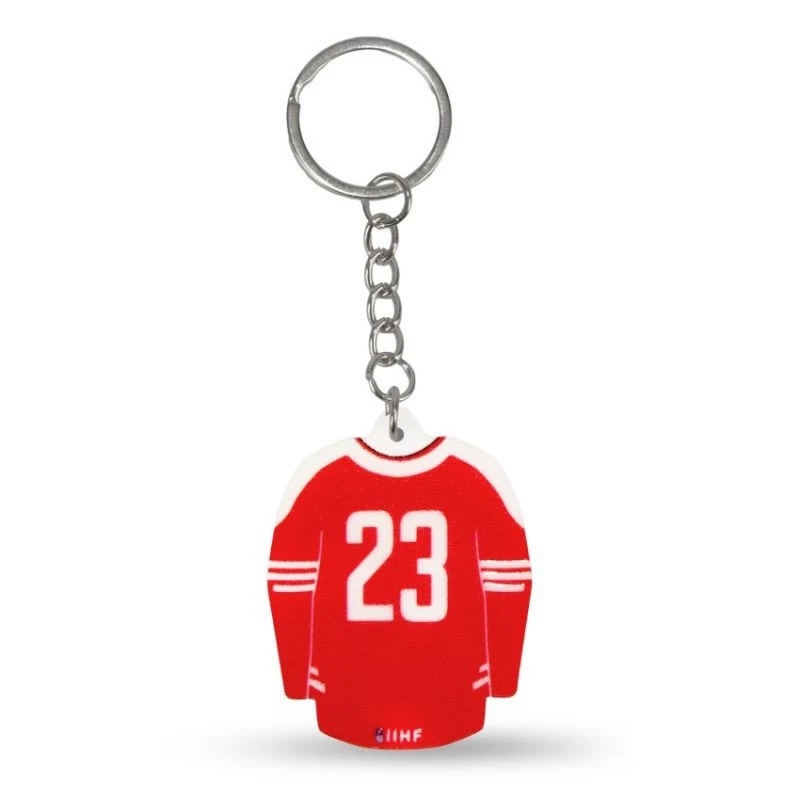 Brelok Koszulka Hokejowa Polska (Away) Pokaż swoje wsparcie dla reprezentacji Polski w hokeju na lodzie z tym unikalnym brelokiem w kształcie koszulki meczowej. Idealny dla kibiców i miłośników sportu, ten brelok to doskonały dodatek do kluczy, plecaka czy torby. Główne cechy: Design: Wersja oficjalnej koszulki hokejowej reprezentacji Polski w czerwono białych barwach. Z przodu znajduje się herb Polski oraz napis "Polska", dodając brelokowi patriotycznego charakteru. Białe detale na rękawach i ramionach podkreślają sportowy styl. Numer "23" na plecach: Na odwrocie widoczny jest czerwony numer "23" oraz logo Międzynarodowej Federacji Hokeja na Lodzie (IIHF), co dodaje autentyczności i sprawia, że brelok wygląda jak prawdziwa koszulka hokejowa. Zalety: Wytrzymały i lekki Praktyczny dodatek dla kibiców Doskonała pamiątka z meczu lub wydarzenia sportowego Ten brelok to świetny sposób na wyrażenie wsparcia dla polskiej drużyny hokejowej oraz doskonały prezent dla każdego fana.