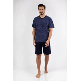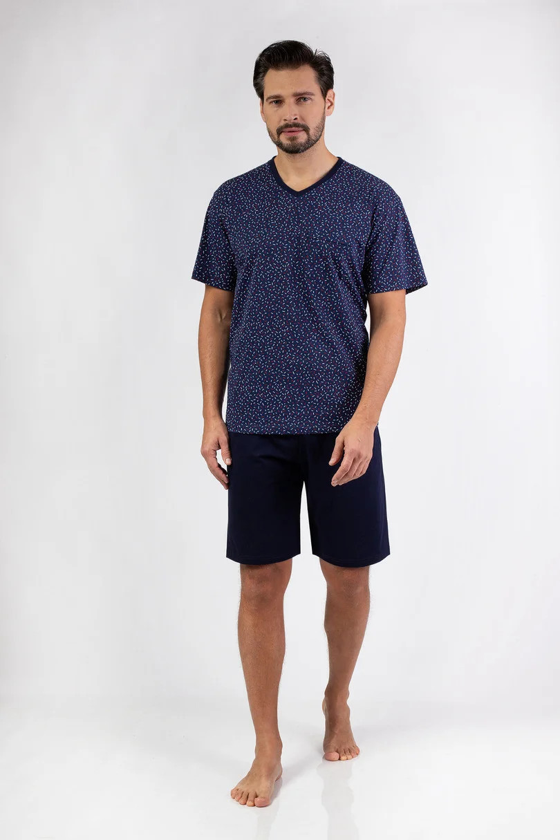 Klasické pánské pyžamo s krátkými rukávy z kvalitní bavlny, se vzorovaným tričkem s výstřihem a jednobarevnými kalhotami s krátkými nohavicemi.