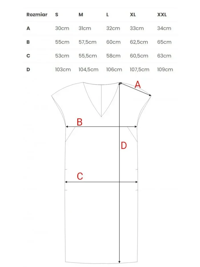65 % polyester 30 % viskóza 5 % elastan DETAILY PRODUKTU: tkaný materiál volný střih šaty délka ke kolenům krátké rukávy výstřih do V skrytý zip rozparek na zádech bez podšívky naše modelka je vysoká 175 cm a nosí velikost S navrženo a vyrobeno v Polsku