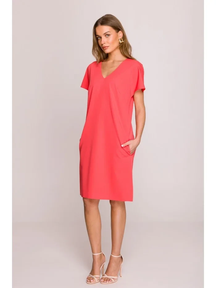 model 20966032 Šaty uvolněného střihu s výstřihem do V korálová barva - STYLOVE