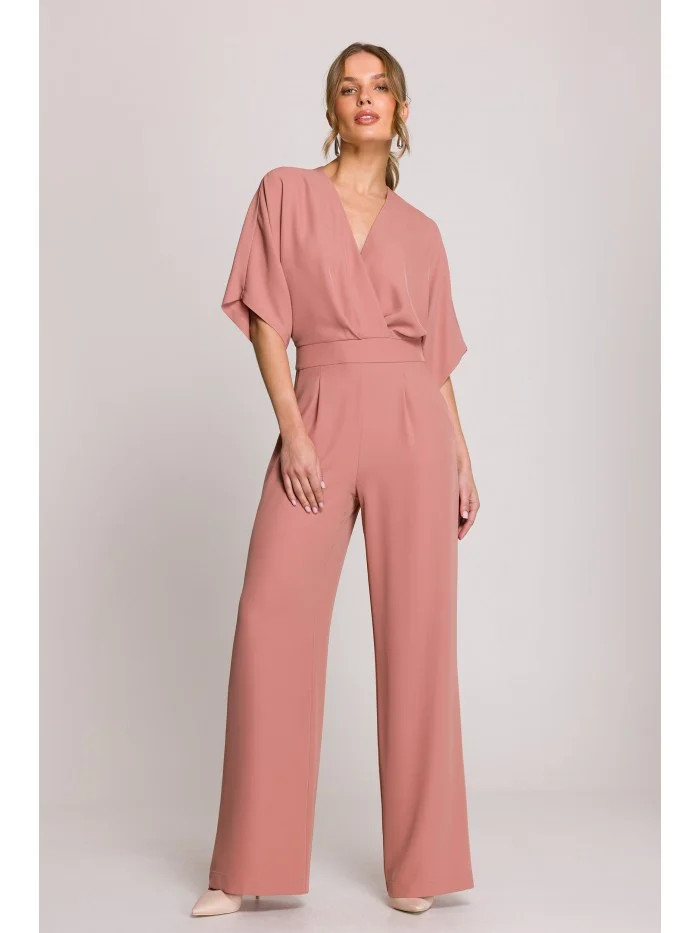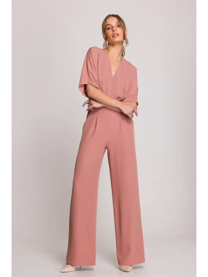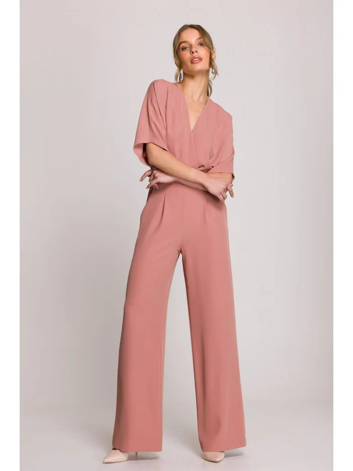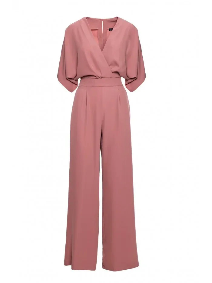 model 20966151 Kombinéza se širokými nohavicemi a zavinovacím výstřihem růžová - STYLOVE