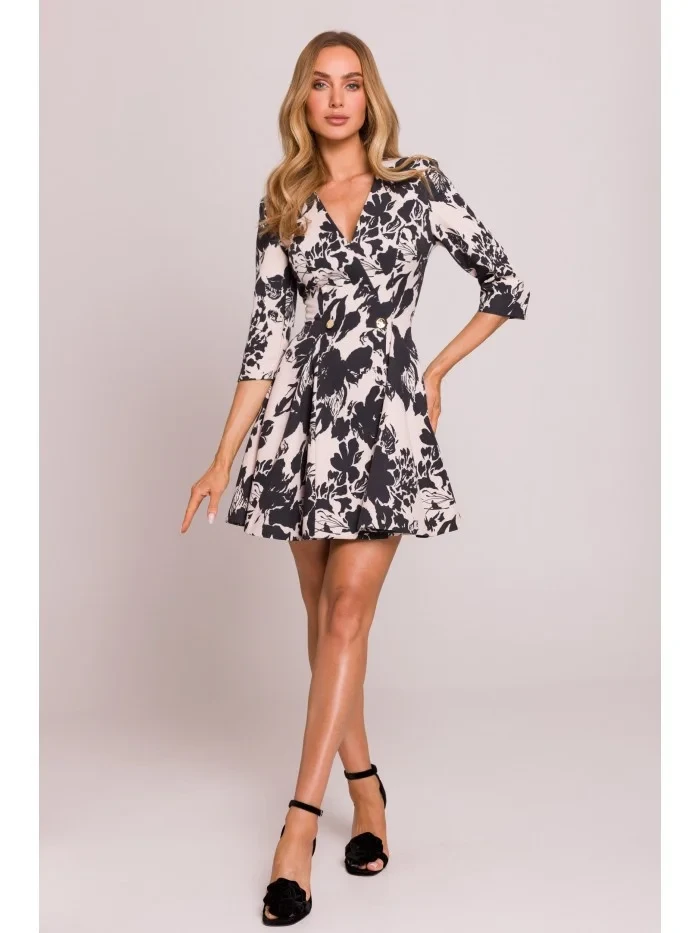 97% polyester 3% spandex INFORMACE O PRODUKTU: tkaná látka s potiskem přiléhavý střih mini šaty s výstřihem ve tvaru V dva ozdobné knoflíky v pase skrytý zip na zádech bez podšívky naše modelka měří 171 cm a nosí velikost S navrženo a vyrobeno v Polsku