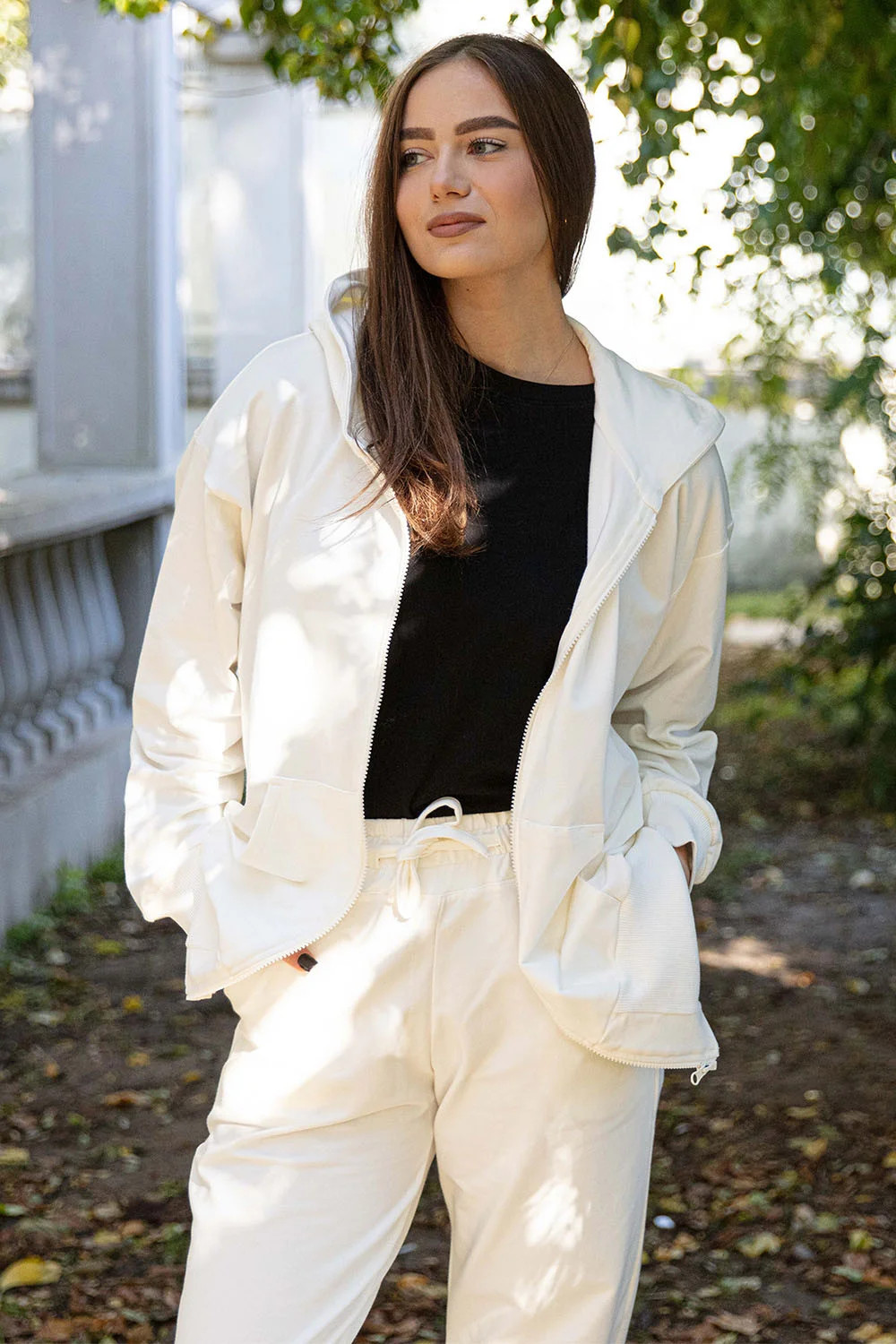 Komplet marki Dkaren. Model DK-K-B1. Produkt został wykonany z 95% bawełna, 5% elastan. Miejsce zapięcia: przód. Posiada kieszenie. Komplet zapinany na zamek. Długość rękawa: długi rękaw. Długość: długie. Produkt damski.