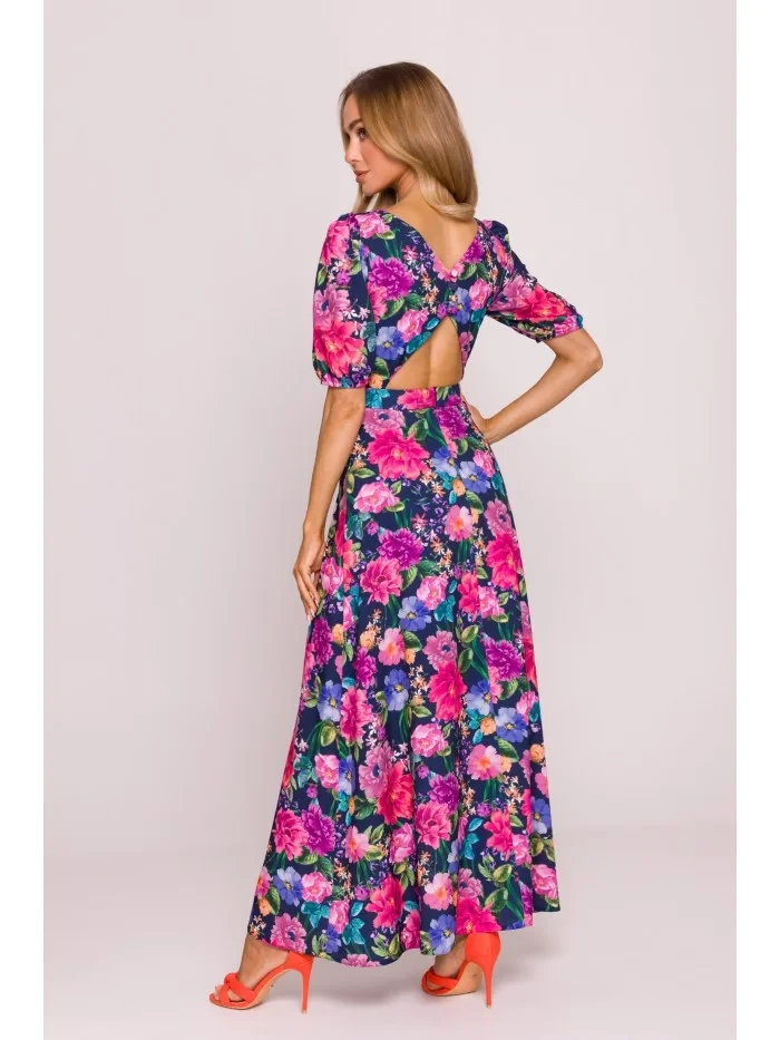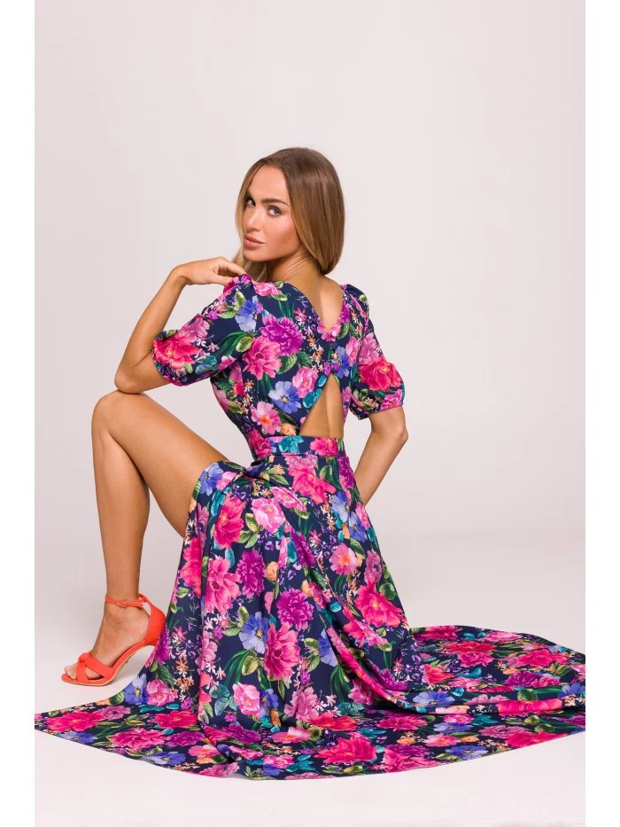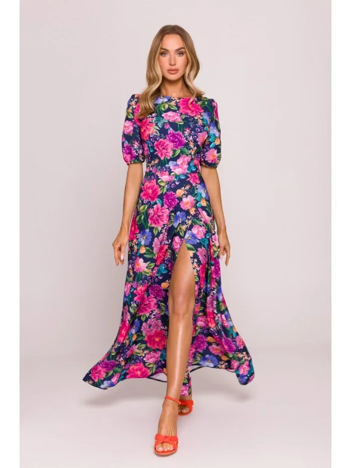 100% polyester Podšívka: 95% polyester 5% elastan MATERIÁL Materiál: jemná potištěná tkanina, matný povrch PODROBNOSTI O PRODUKTU Výstřih: vpředu kulatý výstřih, vzadu volný Kapsy: žádné Vzor: pestrobarevný, květinový Podšívka: částečně podšitá, živůtek podšitý Zapínání: skrytý zadní zip, vzadu knoflíky potažené látkou Model: M858 Navrženo a vyrobeno v Polsku Modelka na fotografii měří 171 cm a má na sobě velikost S STŘIH A VÝSTŘIH Střih: ženský střih Tvar: vypasovaný živůtek s rozšířenou sukní a vysokým rozparkem na nohou Délka: maxi Délka rukávů: krátké nadýchané rukávy, nabírané, s manžetou
