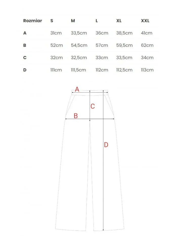 95% polyester 5% elastan MATERIÁL Materiál: lehká strukturovaná tkanina (krep), matný povrch PODROBNOSTI O PRODUKTU Pas: vysoký, elastický pás Zapínání: nazouvací (bez zipu) Kapsy: žádné Model: M862 Navrženo a vyrobeno v Polsku Modelka na fotografii měří 171 cm a má na sobě velikost S STŘIH A VÝSTŘIH Střih: volný Tvar: široké kalhoty Délka: po celé délce