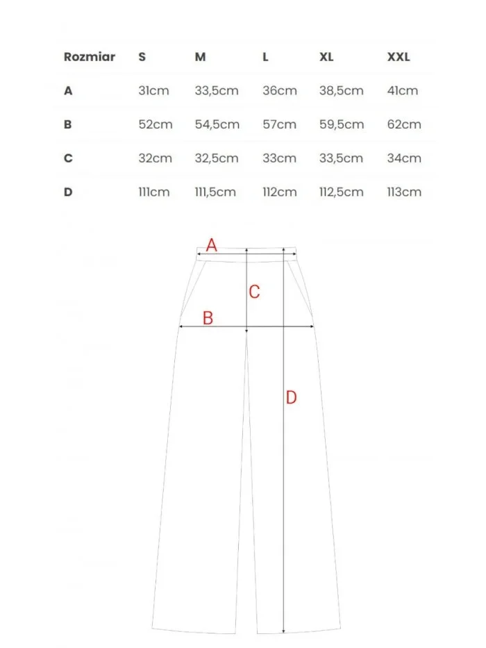95% polyester 5% elastan MATERIÁL Materiál: lehká strukturovaná tkanina (krep), matný povrch PODROBNOSTI O PRODUKTU Pas: vysoký, elastický pás Zapínání: nazouvací (bez zipu) Kapsy: žádné Model: M862 Navrženo a vyrobeno v Polsku Modelka na fotografii měří 171 cm a má na sobě velikost S STŘIH A VÝSTŘIH Střih: volný Tvar: široké kalhoty Délka: po celé délce