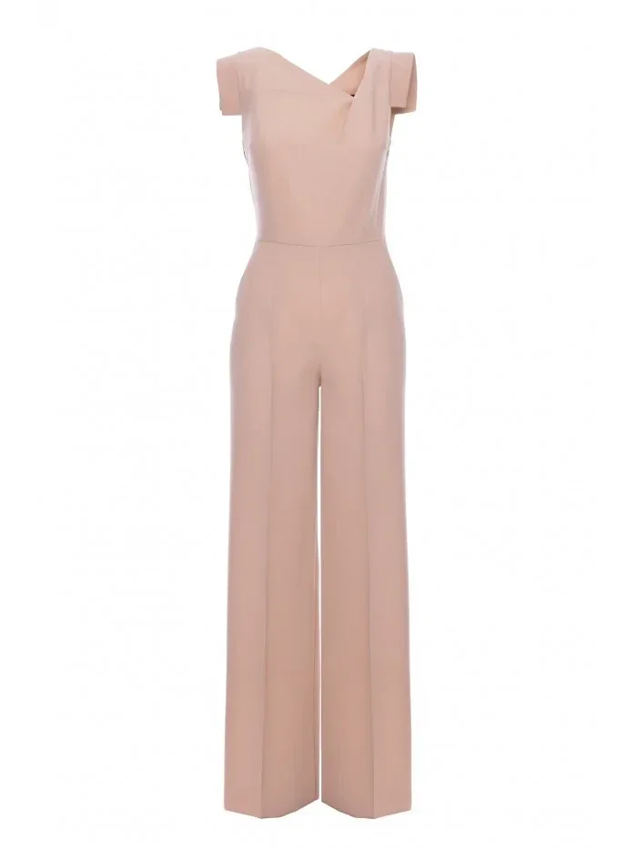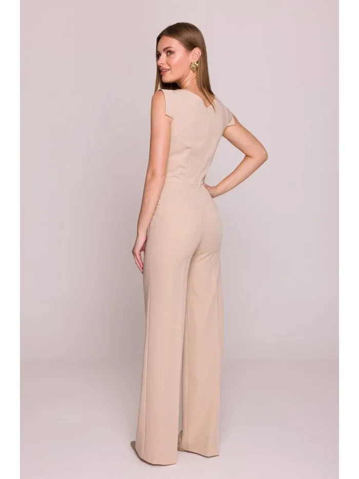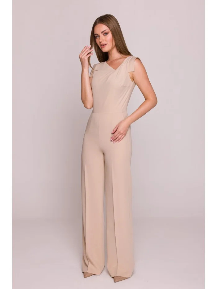 model 21154696 Elegantní overal s asymetrickým výstřihem béžový - STYLOVE