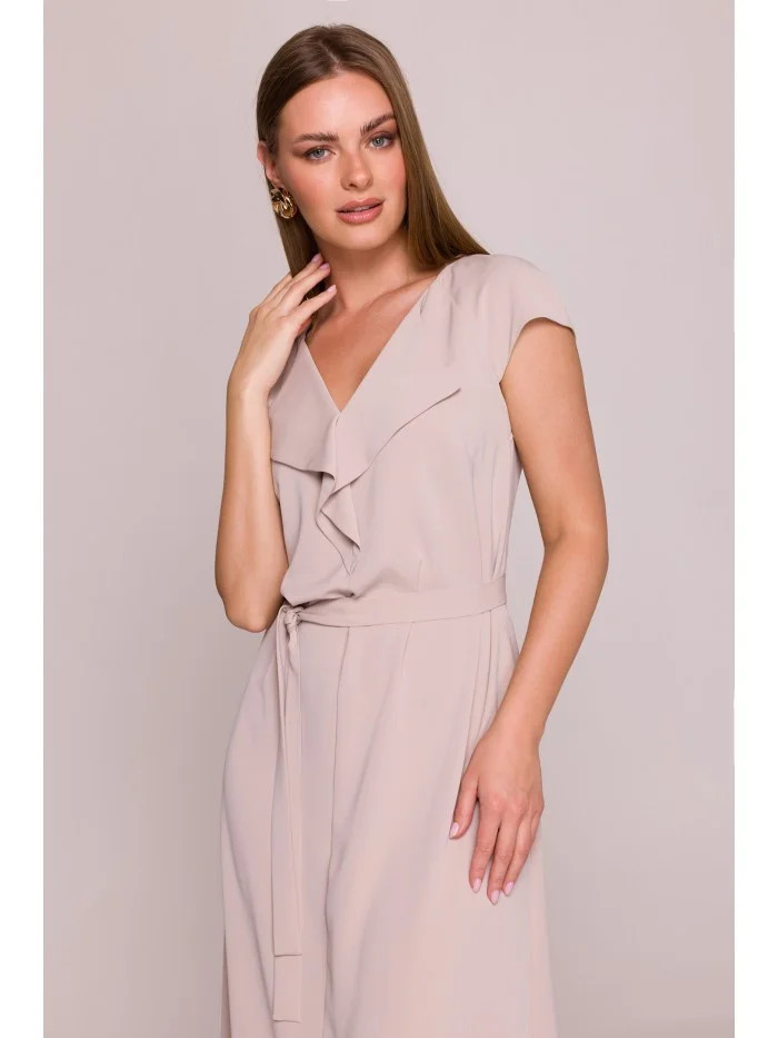 model 21154800 Šaty bez rukávů s volánkovým výstřihem béžové - STYLOVE