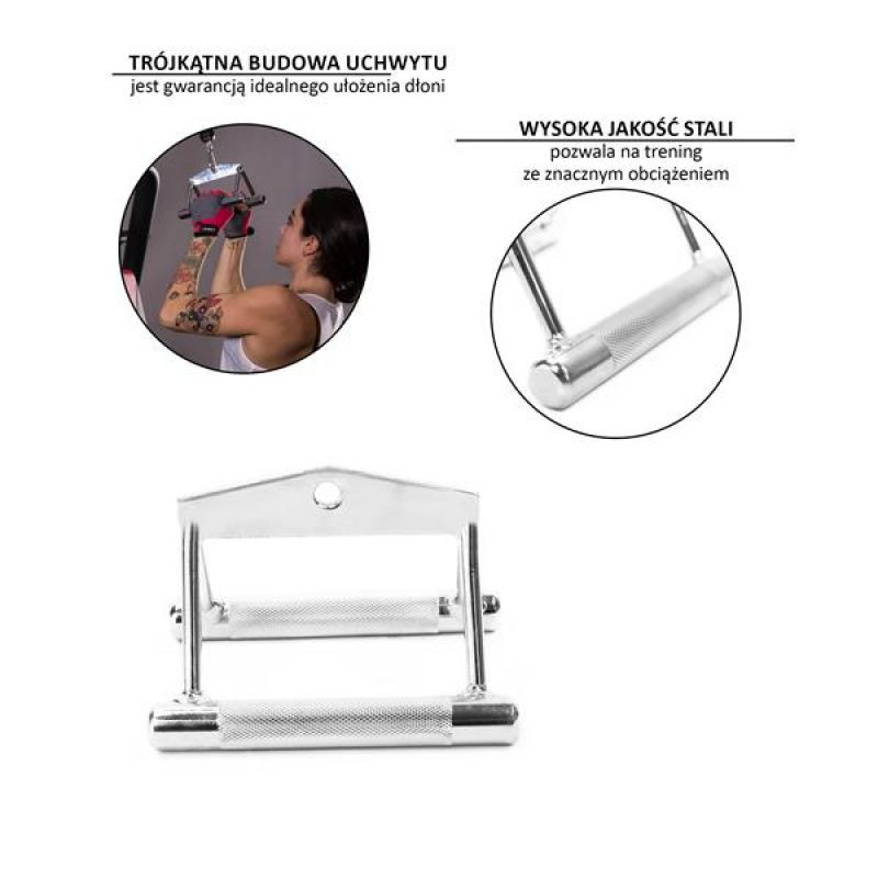 Trojúhelníková konstrukce rukojeti zaručuje dokonalou polohu rukou a zároveň zajišťuje správný pohyb při cvičení. Ocelová hrubá rukojeť zajišťuje bezpečné uchopení a zabraňuje vyklouznutí náčiní z ruky, přičemž vyžaduje pevnější úchop. Tímto způsobem také pracujeme na rozvoji svalů předloktí. Nepříliš velký rozestup rukojetí usnadňuje udržení správné trajektorie, tj. vedení loktů blízko trupu. Díky tomu, že je vyroben z vysoce kvalitní oceli, můžete trénovat se značnou zátěží.