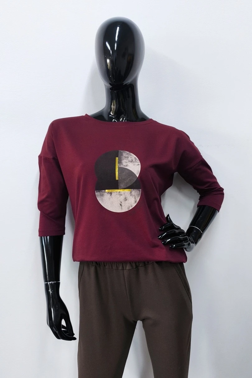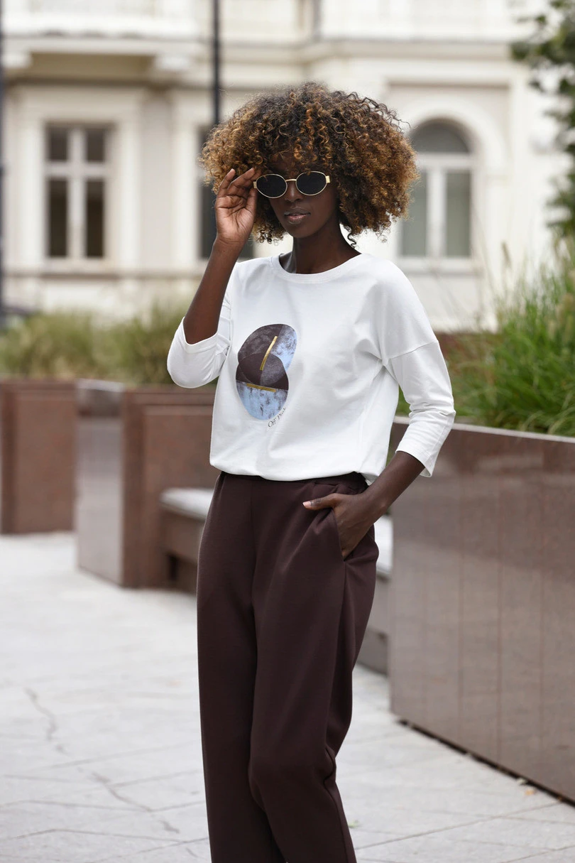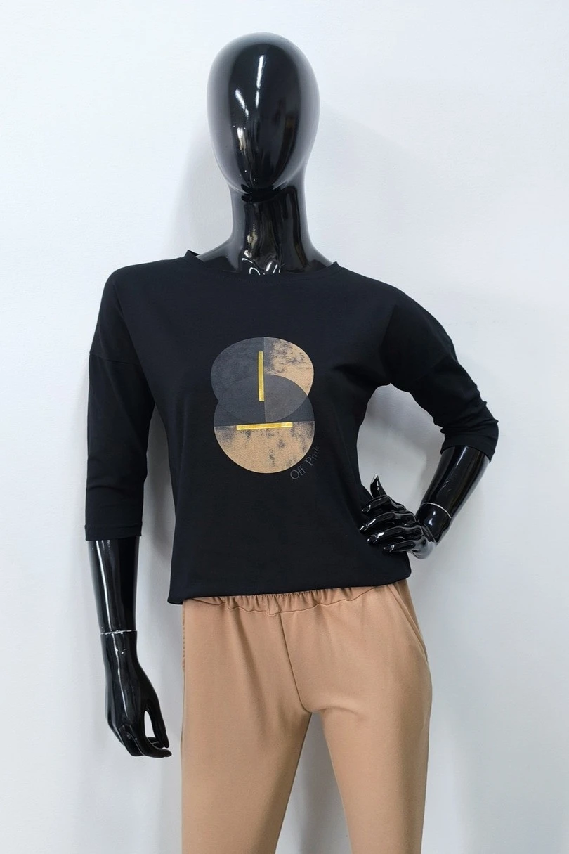 Kolika – bluzka damska z nadrukiem i rękawem 3/4 to idealne połączenie elegancji i komfortu. Wyróżnia się subtelnym, złotym nadrukiem na przodzie, który nadaje jej unikalnego charakteru. Dzięki prostemu fasonowi z klasycznym wykończeniem dołu, świetnie dopasowuje się do różnych typów sylwetek i stylizacji. Wysokiej jakości dzianina z bawełną i elastanem gwarantuje wygodę noszenia przez cały dzień – w pracy, na spotkaniu czy spacerze.
