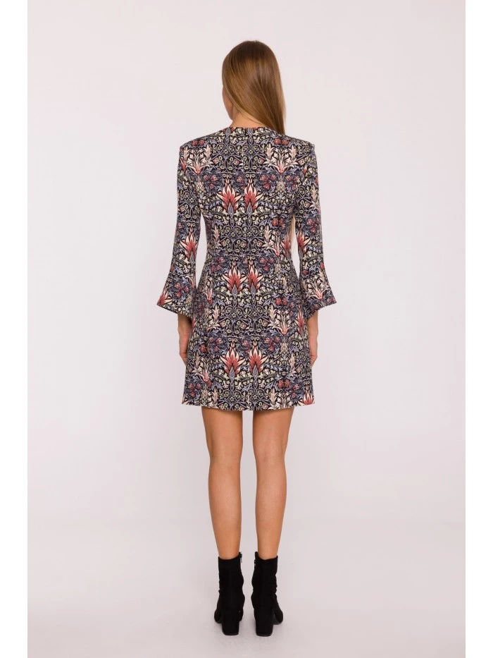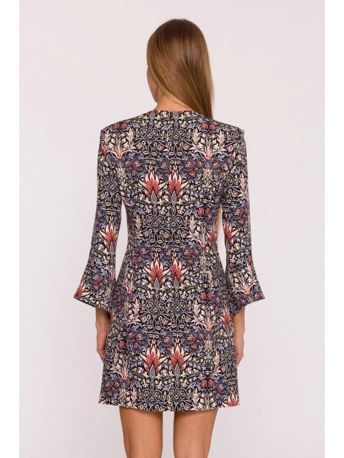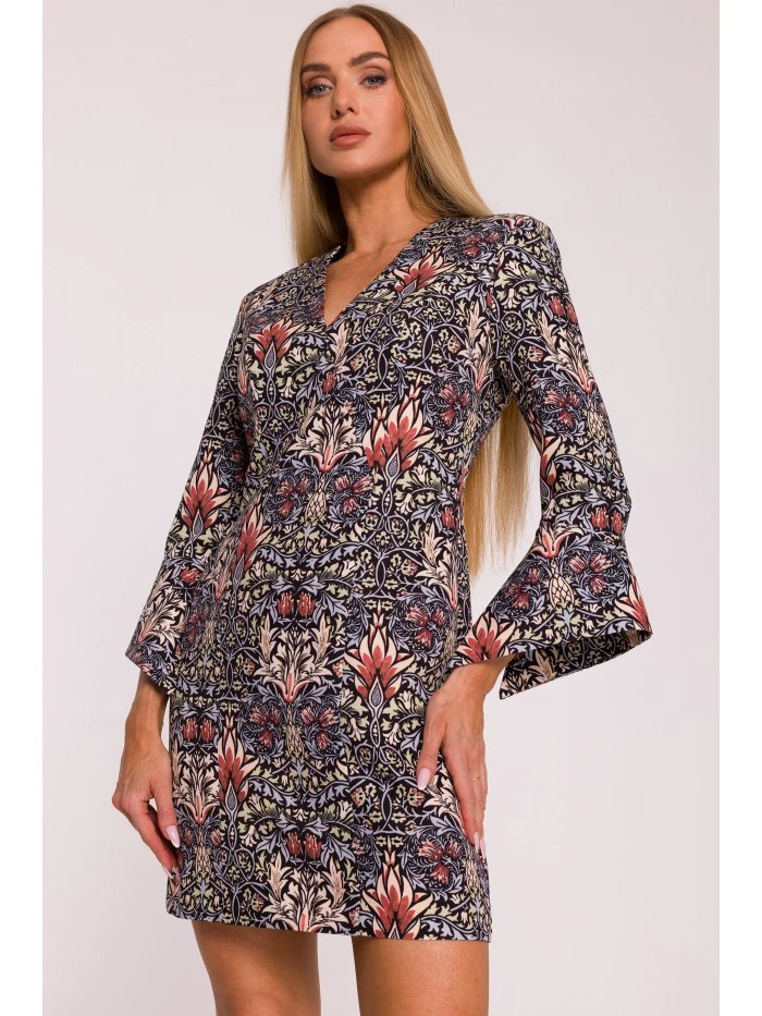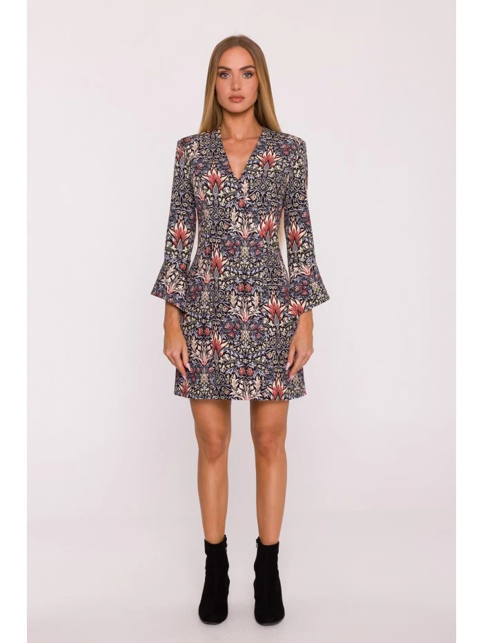 materiál: 95% polyester 5% elastan Tkanina: vícebarevný botanický potisk; matný povrch PODROBNOSTI O PRODUKTU Výstřih: do V Rukávy: 7/8 délky, mírně rozšířené na manžetách Zapínání: skrytý zip na zádech Kapsy: žádné Podšívka: žádná Vzor: dekorativní, květinový, inspirovaný retro stylem Model: M877 Navrženo a vyrobeno v Polsku Modelka na fotografii měří 171 cm a má na sobě velikost S STYL A STŘIH Styl: rovný, mírně vypasovaný Tvar: mírně vypasovaný na ramenou, volný směrem k lemu Délka: mini