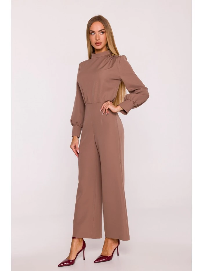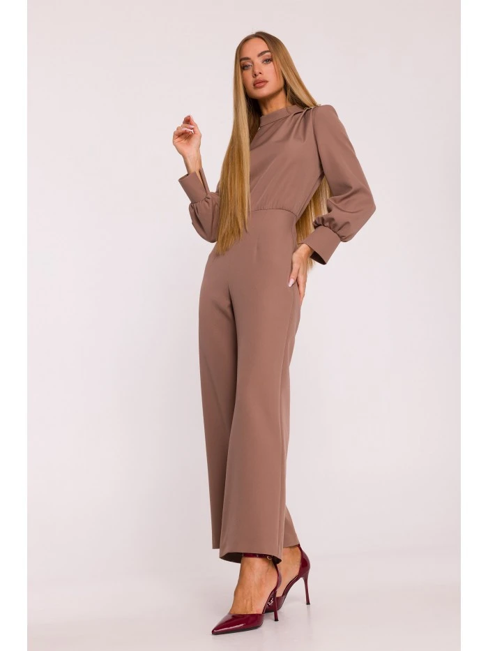 materiál: 95% polyester 5% elastan Tkanina: hladká tkanina s matným povrchem PODROBNOSTI O PRODUKTU Výstřih: stojáček s jemným řasením na ramenou Rukávy: dlouhé, zakončené širokými manžetami s rozparkem Zapínání: skrytý zip na zádech Kapsy: žádné Nohy: široké, 7/8 délka Podšívka: žádná Detaily: ozdobné knoflíky na rameni Vzor: hladký Model: M879 Navrženo a vyrobeno v Polsku Modelka na fotografii měří 171 cm a má na sobě velikost S STYL A STŘIH Styl: elegantní, ženský Tvar: mírně vypasovaný top s řasením, vypasovaný pas, široké nohavice Délka: jednodílný overal, 7/8 délka nohavic