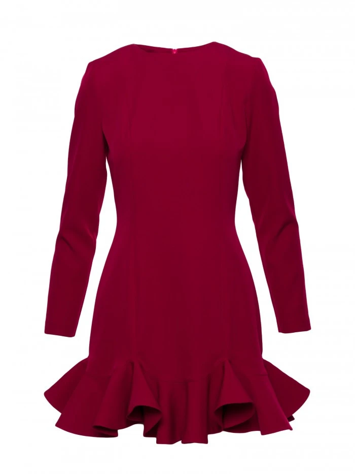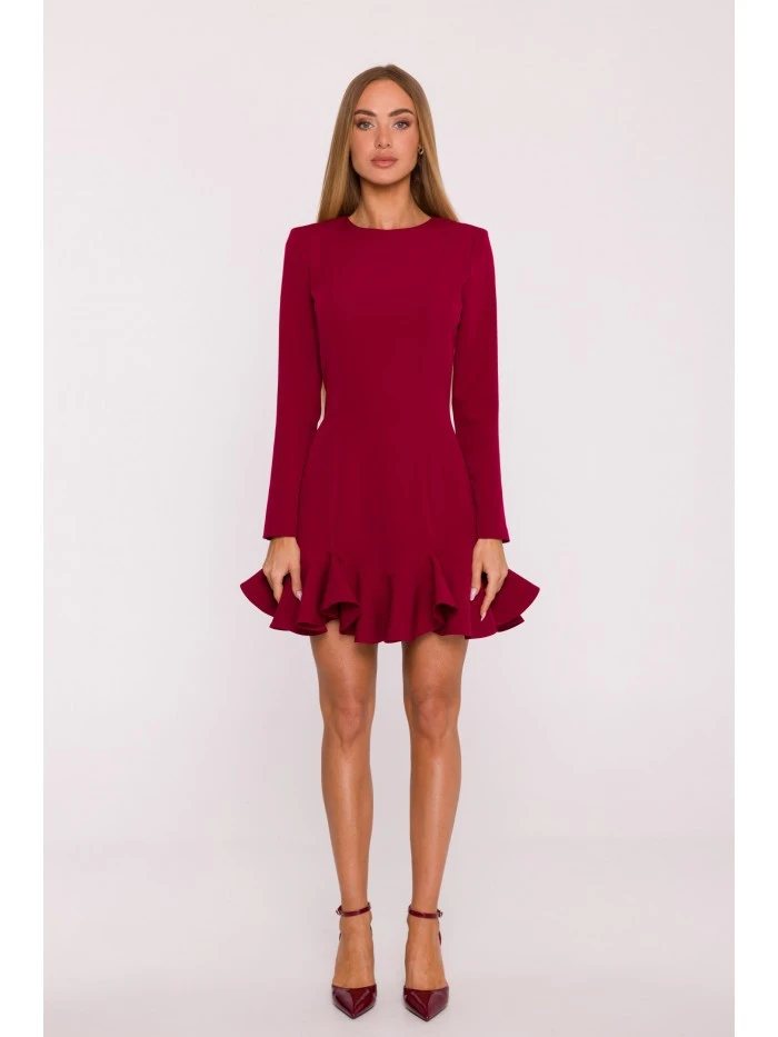 materiál: 95% polyester 5% elastan Tkanina: hladká tkanina s matným povrchem PODROBNOSTI O PRODUKTU Výstřih: klasický, kulatý Rukávy: dlouhé Zapínání: skrytý zip na zádech Kapsy: žádné Podšívka: žádná Detaily: ozdobný volánek na lemu Model: M880 Navrženo a vyrobeno v Polsku Modelka na fotografii měří 171 cm a má na sobě velikost S STYL A STŘIH Styl: mírně vypasovaný Tvar: rovný, mírně vypasovaný živůtek s tvarujícími švy, rozšířená sukně s volánkovým lemem Délka: mini