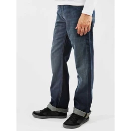 Pánské džínové kalhoty s rozšířenými nohavicemi a vysokým pasem, se zapínáním na zip a nášivkou s logem výrobce na zadní straně.