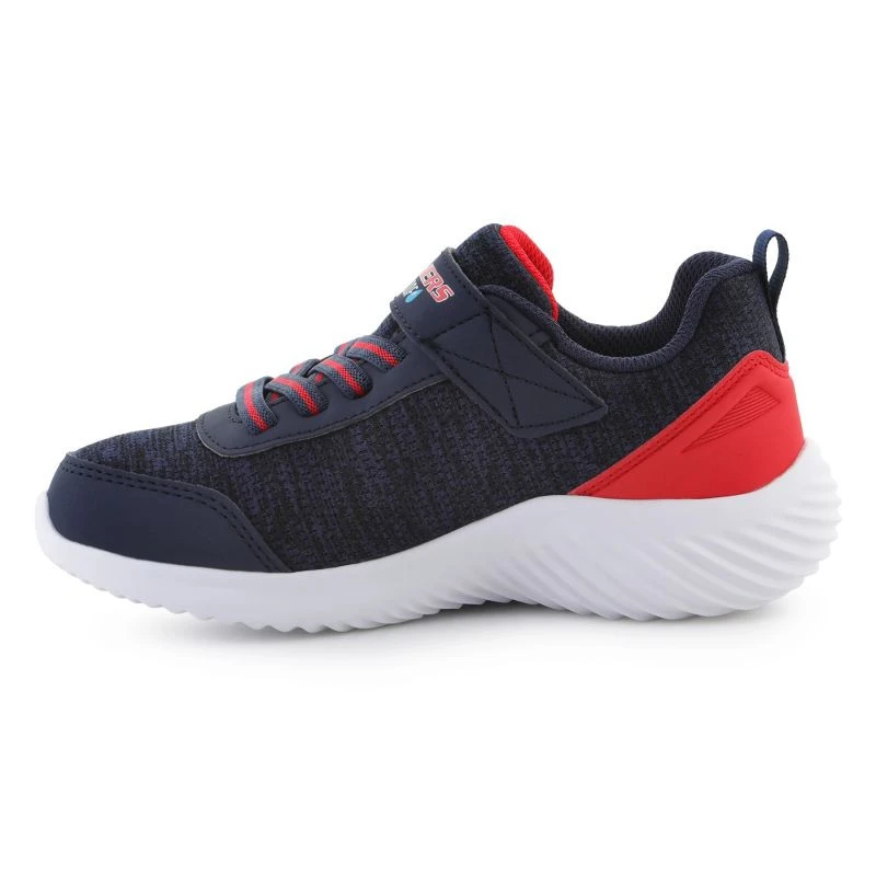 Sneakersy Skechers Bounder-Dripper Drop 403739L-NVRD to dynamicznie zaprojektowane obuwie dziecięce, które doskonale sprawdzi się podczas zabaw na zewnątrz. Wodoodporna konstrukcja z uszczelnionymi szwami zapewnia ochronę przed wilgocią, a cholewka z oddychającej siateczki i wytrzymałego materiału syntetycznego zapewnia komfort i trwałość. Elastyczne sznurówki wraz z regulowanym paskiem na śródstopiu umożliwiają szybkie i pewne dopasowanie. Wkładka zapewnia miękkie odczucie stóp, natomiast lekka podeszwa środkowa amortyzuje wstrząsy. Elastyczna podeszwa zewnętrzna gwarantuje dobrą przyczepność na różnych powierzchniach. Buty są lekkie, stylowe i idealne na mokre dni.