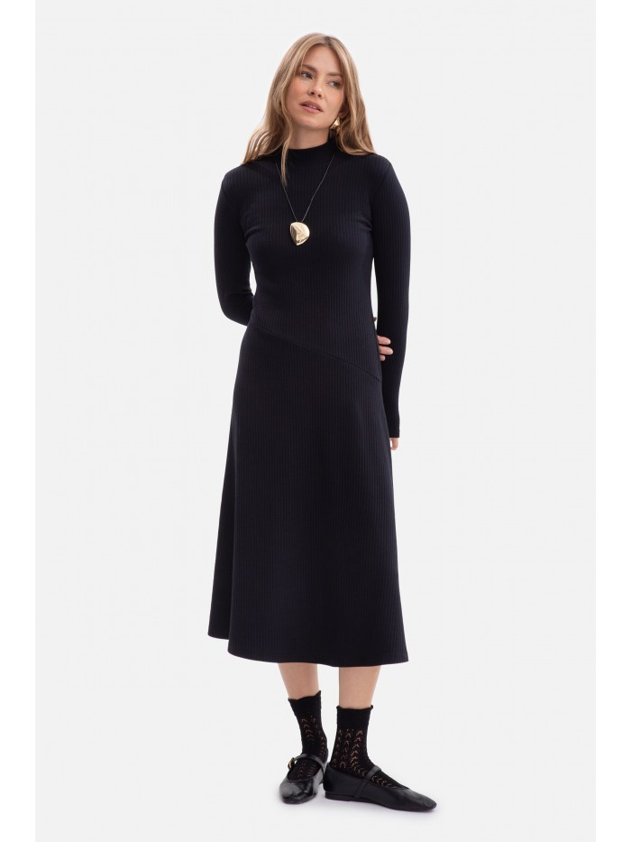 model 21379828 Žebrované midi šaty s asymetrickým pasem černé - BeWear