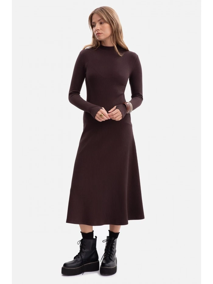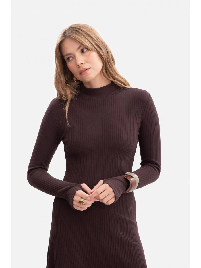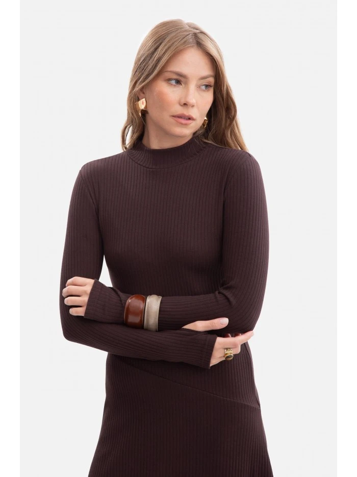 model 21379836 Žebrované midi šaty s asymetrickým pasem tmavě čokoládové - BeWear