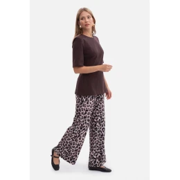 65% polyester 30% wiskoza 5% elastan MATERIÁL Materiál: kartáčovaný úplet s potiskem, měkký na dotek s jemným vlasem PODROBNOSTI O VÝROBKU Pas: středně vysoký Zapínání: žádné - elastický pásek Kapsy: žádné Nohy: dlouhé, široké, rovné Podšívka: žádná Model: B302 Navrženo a vyrobeno v Polsku z látky vyrobené v Polsku Modelka na fotografii měří 171 cm a má na sobě velikost S/M STYL A STŘIH Střih: volný, ležérní Tvar: vypasovaný v pase a na bocích, od stehen dolů rozšířený Délka: po celé délce, splývající až na zem