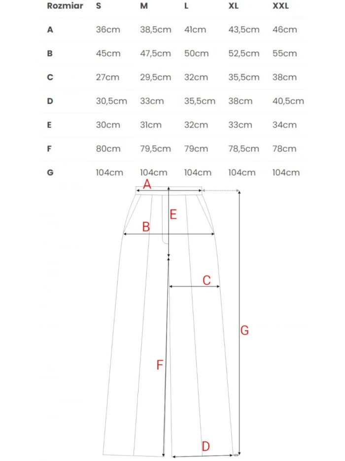 materiál: 95% polyester 5% elastan Tkanina: Hladká tkanina s matnou úpravou PODROBNOSTI O PRODUKTU Pas: Střední pas Zapínání: Knoflík vpředu a skrytý zip Kapsy: Boční kapsy Nohy: Dlouhé, široké nohavice s lisovanými záhyby Podšívka: Bez podšívky Model: M875 Navrženo a vyrobeno v Polsku Modelka na fotografii měří 171 cm a má na sobě velikost S Střih a střih Střih: Klasický střih se širokou siluetou Tvar: Přiléhavý v pase a na bocích, volný od stehen dolů Délka: Po zem