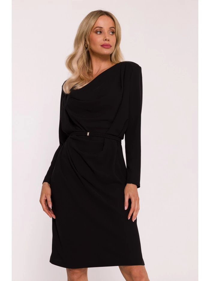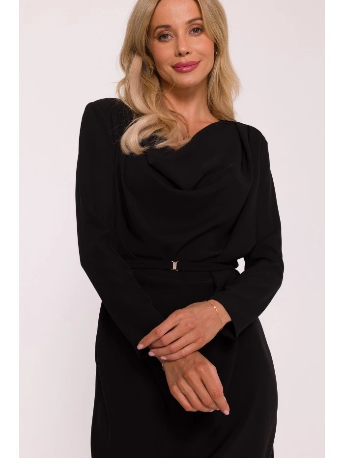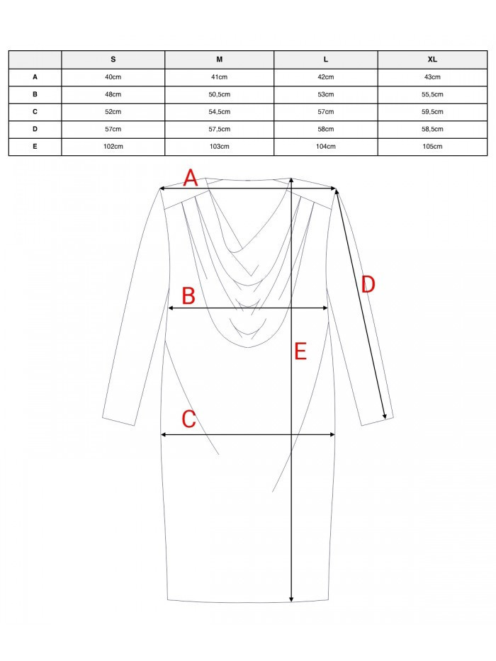 materiál: 95% polyester 5% elastan LÁTKA: hladká látka s jemným leskem PODROBNOSTI O PRODUKTU Výstřih: smyslný, jemně řasený výstřih typu cowl Rukávy: dlouhé Sukně: rovná, s bočním rozparkem Pas: zvýrazněný elastickým páskem ze stejné látky Zapínání: žádné - slip-on styl Model: S428 Navrženo a vyrobeno v Polsku Modelka je vysoká 174 cm a nosí velikost S STYL A STŘIH Styl: elegantní tužkové šaty s výstřihem typu cowl Tvar: volnější horní díl, zúžená sukně Délka: nad kolena