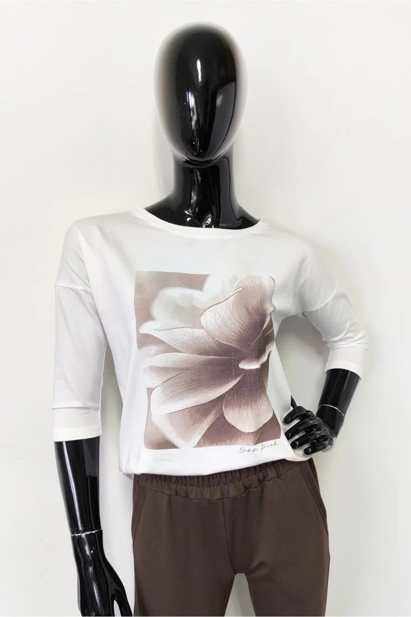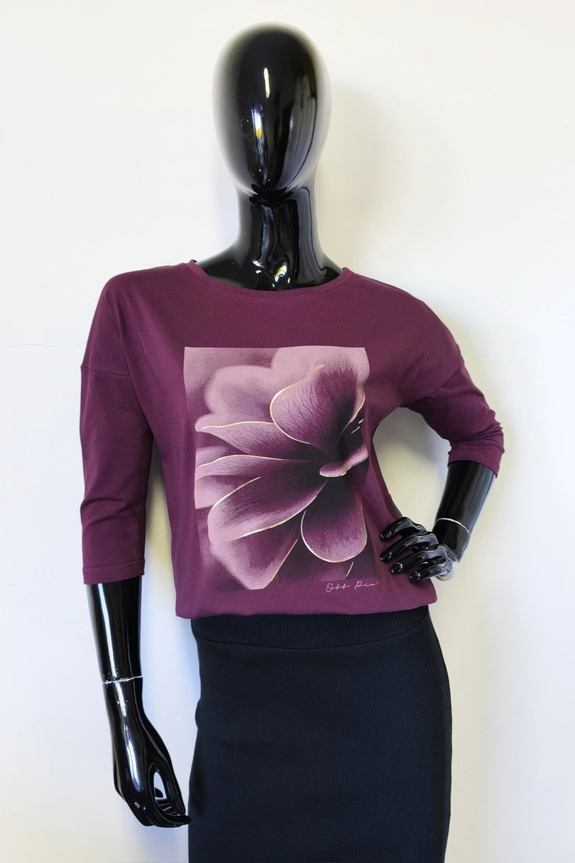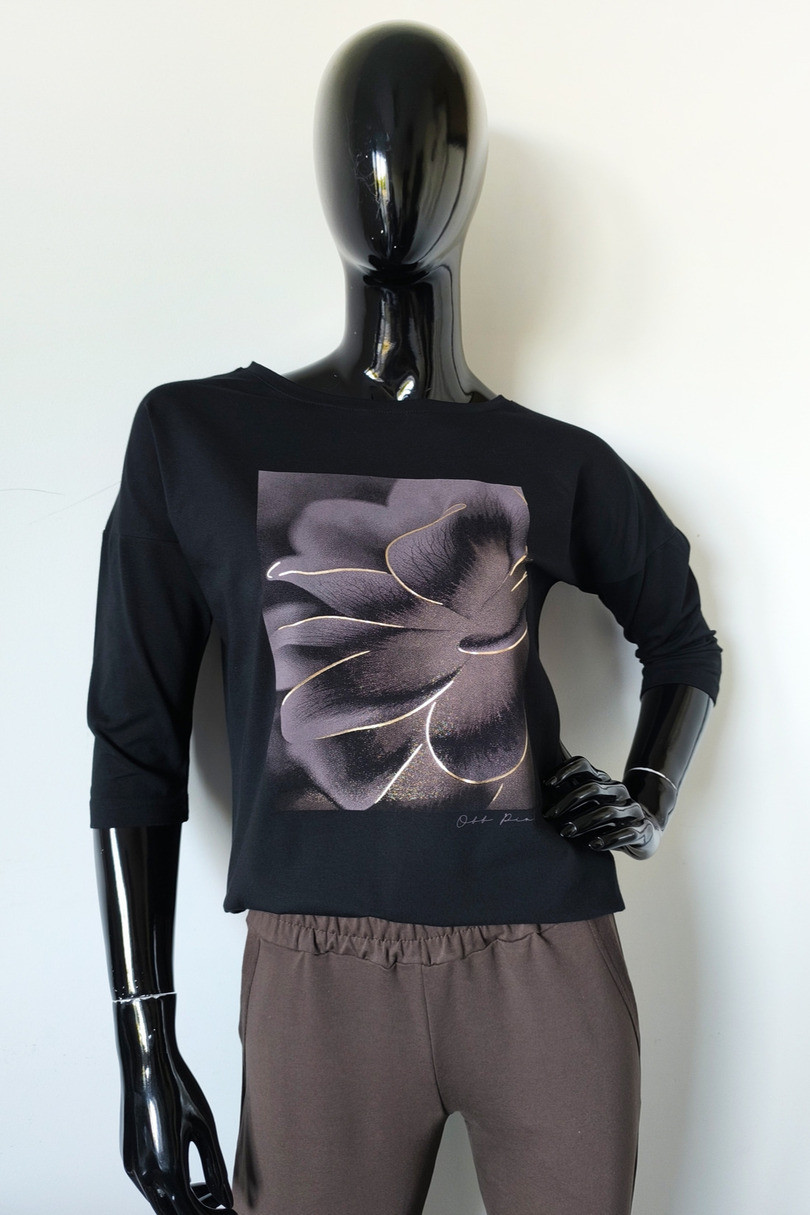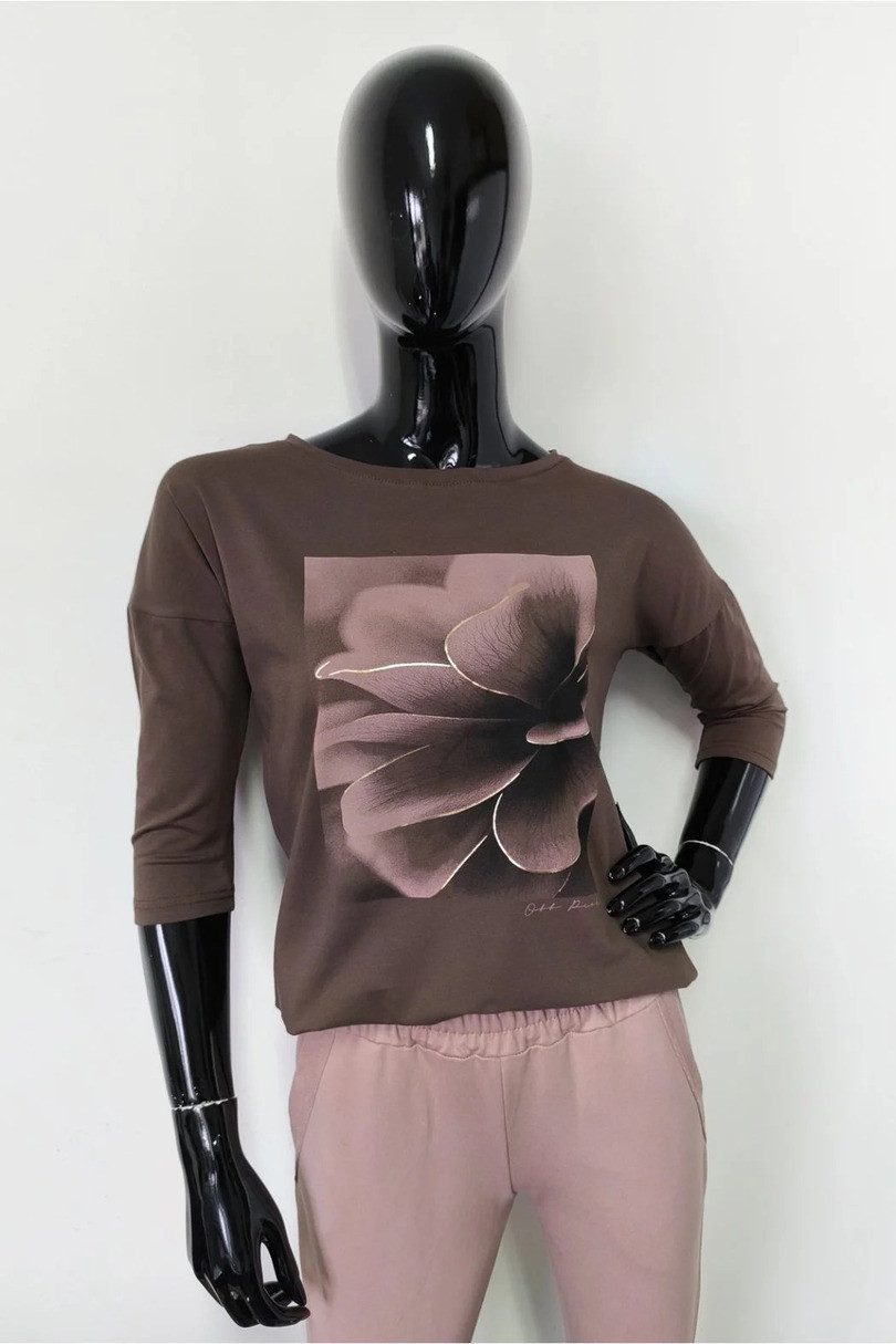 Bluzka damska z rękawem 3/4 to połączenie elegancji i wygody w codziennym wydaniu. Wykonana z wysokiej jakości dzianiny bawełnianej z dodatkiem elastanu, zapewnia doskonałe dopasowanie i komfort noszenia przez cały dzień. Na przodzie bluzki znajduje się efektowny nadruk ze złotymi akcentami, które subtelnie połyskują, dodając stylizacji kobiecego charakteru. Prosty krój z wykończeniem dolnej części prostą linią umożliwia noszenie bluzki zarówno wpuszczonej w spodnie lub spódnicę, jak i luźno wypuszczonej na zewnątrz. To idealny wybór do biura, na spotkanie czy na co dzień.