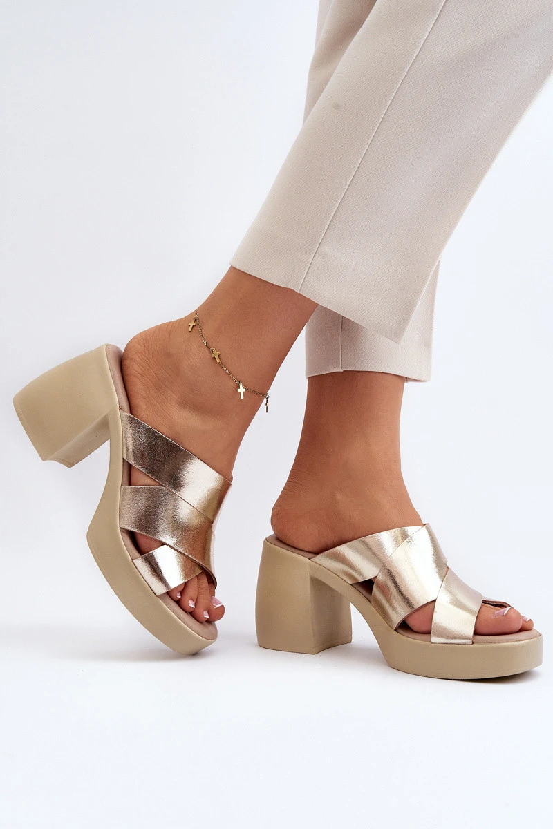 model 21647949 Kožené Klapky Na Podpatku Zlaté - Zazoo