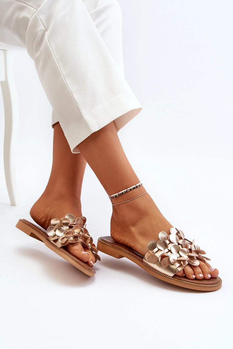 model 21650258 Dámské Kožené Žabky Na Ploché Podrážce Zlaté - Zazoo