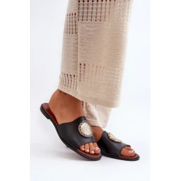 model 21665471 Kožené Žabky Na Ploché Podrážce S Ozdobou Černé - Zazoo