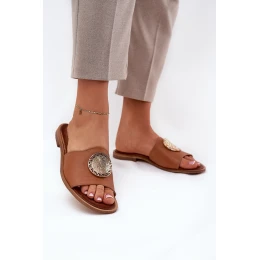 model 21686332 Kožené Pantofle Na Plochém Podpatku S Dekorací Camel - Zazoo