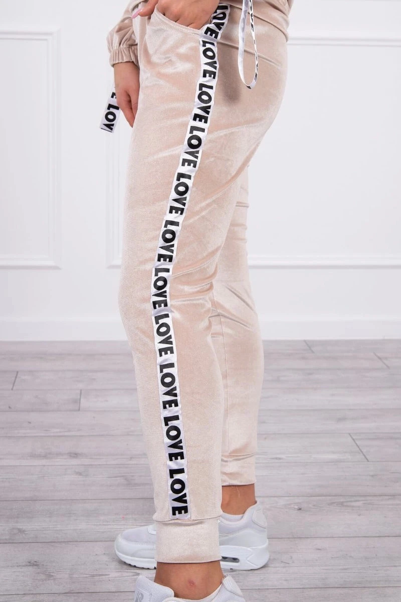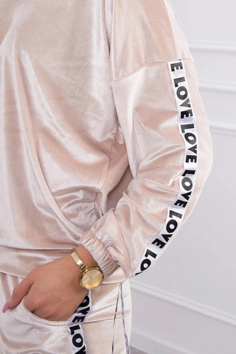 Představujeme vám sadu mikiny a kalhot. Sada z veluru. Mikina má stuhy s nápisem Love. Kalhoty s kapsami a zavazováním v pase. Velmi módní a stylová sada. Sada je vyrobena z vysoce kvalitního materiálu. Velikost je univerzální a vyhovuje dámám velikosti S, M nebo L.