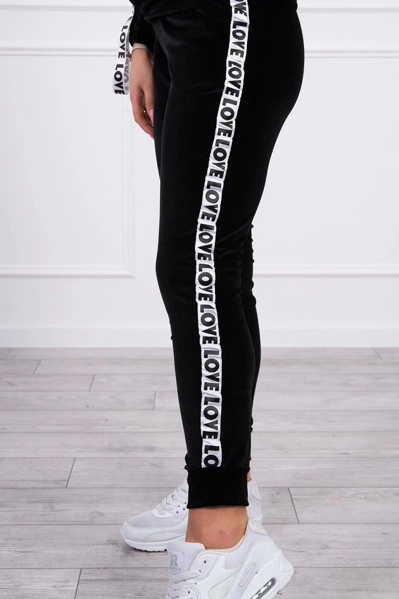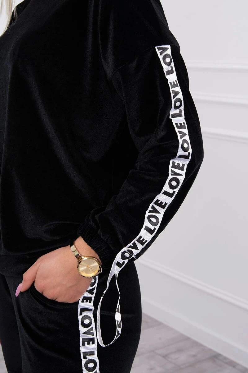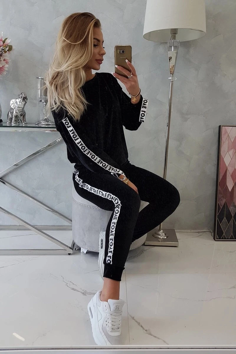 Představujeme vám sadu mikiny a kalhot. Sada z veluru. Mikina má stuhy s nápisem Love. Kalhoty s kapsami a zavazováním v pase. Velmi módní a stylová sada. Sada je vyrobena z vysoce kvalitního materiálu. Velikost je univerzální a vyhovuje dámám velikosti S, M nebo L.