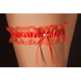 Červený krajkový a saténový podvazek zdobený mašlí s třpytivými kamínky.