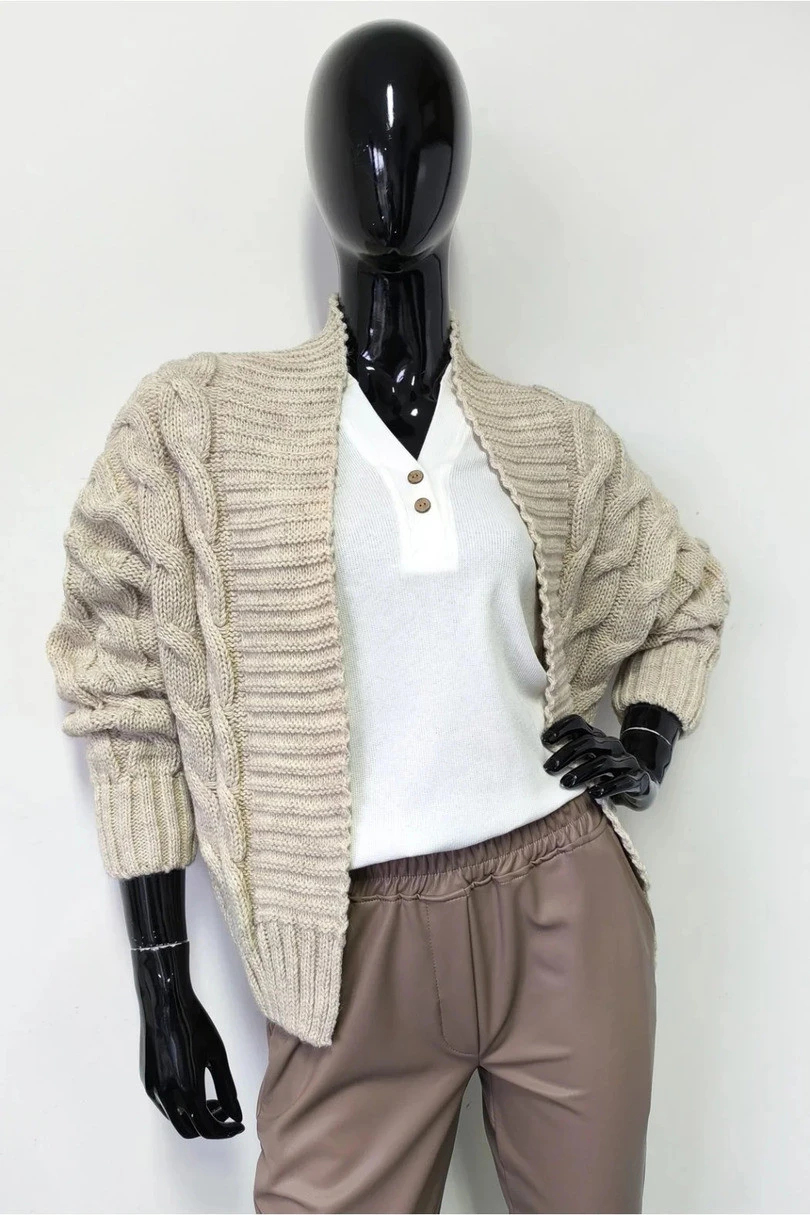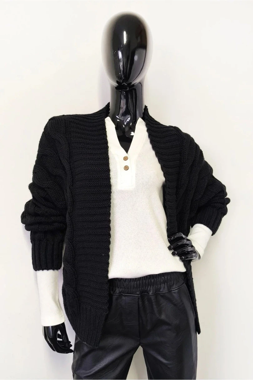 Model KIARA to kardigan stworzony z myślą o kobietach, które cenią sobie wygodę, nowoczesny styl oraz ponadczasową uniwersalność. Sweter ma luźny, oversize’owy krój, dzięki czemu zapewnia maksymalny komfort noszenia i idealnie dopasowuje się do każdego typu sylwetki. Wykonany z miękkiej, przyjemnej w dotyku dzianiny, kardigan sprawdzi się idealnie w chłodniejsze dni, oferując przyjemne otulenie i modny wygląd jednocześnie. Zastosowany splot nadaje mu interesującą strukturę i podkreśla jego unikatowy charakter. KIARA to model, który z łatwością dopasujesz do niemal każdej stylizacji — od codziennych zestawów z jeansami i T-shirtem, po bardziej eleganckie outfity z koszulą czy sukienką. To wszechstronny sweter, który stanie się niezastąpionym elementem garderoby na wiele sezonów.
