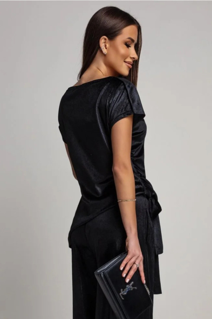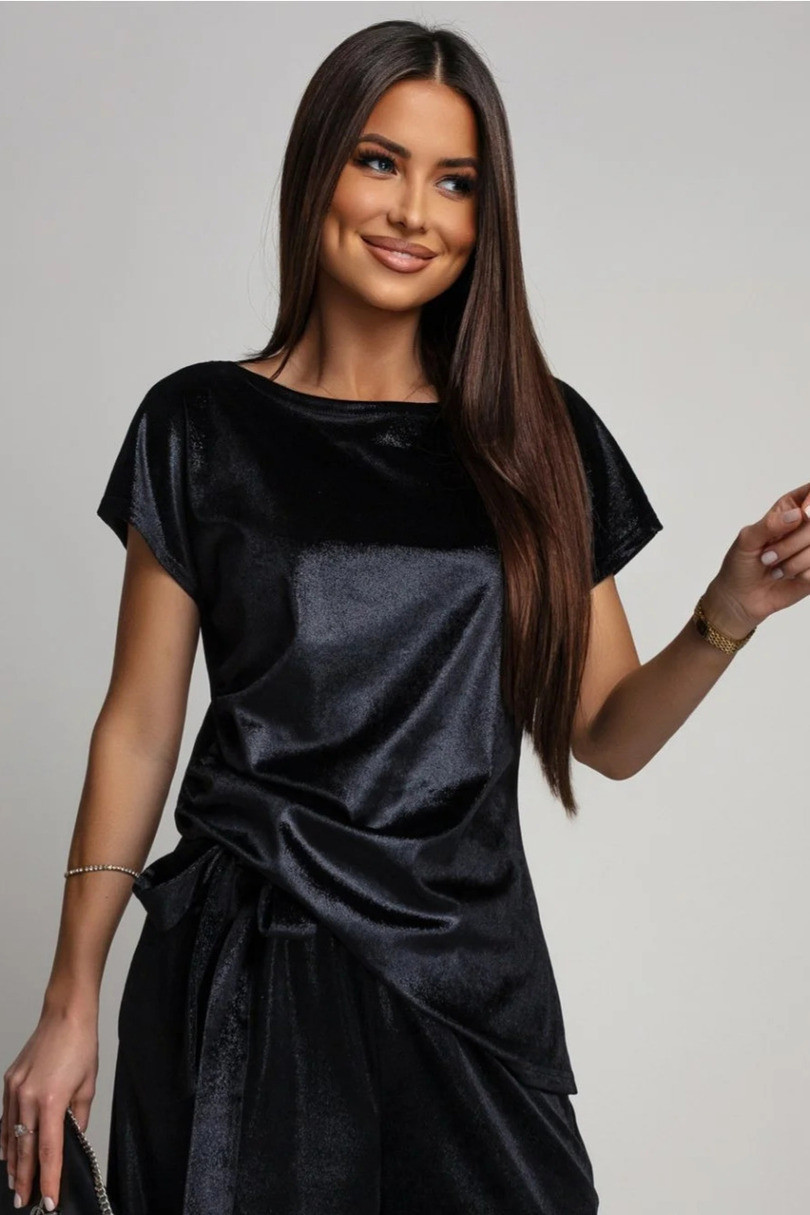 Elegancka bluzka damska z krótkim rękawem, stworzona z myślą o kobietach ceniących styl, komfort i subtelną elegancję. Model wykonany został z miękkiego, połyskującego materiału przypominającego zamsz, który pięknie układa się na sylwetce i dodaje jej wyjątkowego charakteru. Największą ozdobą bluzki jest delikatne marszczenie umieszczone po prawej stronie. To przemyślane rozwiązanie nie tylko nadaje całości asymetrycznego, modnego kroju, ale także sprytnie maskuje ewentualne niedoskonałości figury, optycznie wysmuklając talię. Bluzka doskonale sprawdzi się zarówno w stylizacjach codziennych, jak i bardziej eleganckich — z dopasowanymi spodniami, spódnicą czy marynarką stworzy zestaw idealny na spotkanie, do pracy czy na wieczorne wyjście. To propozycja dla kobiet, które chcą wyglądać stylowo bez wysiłku.