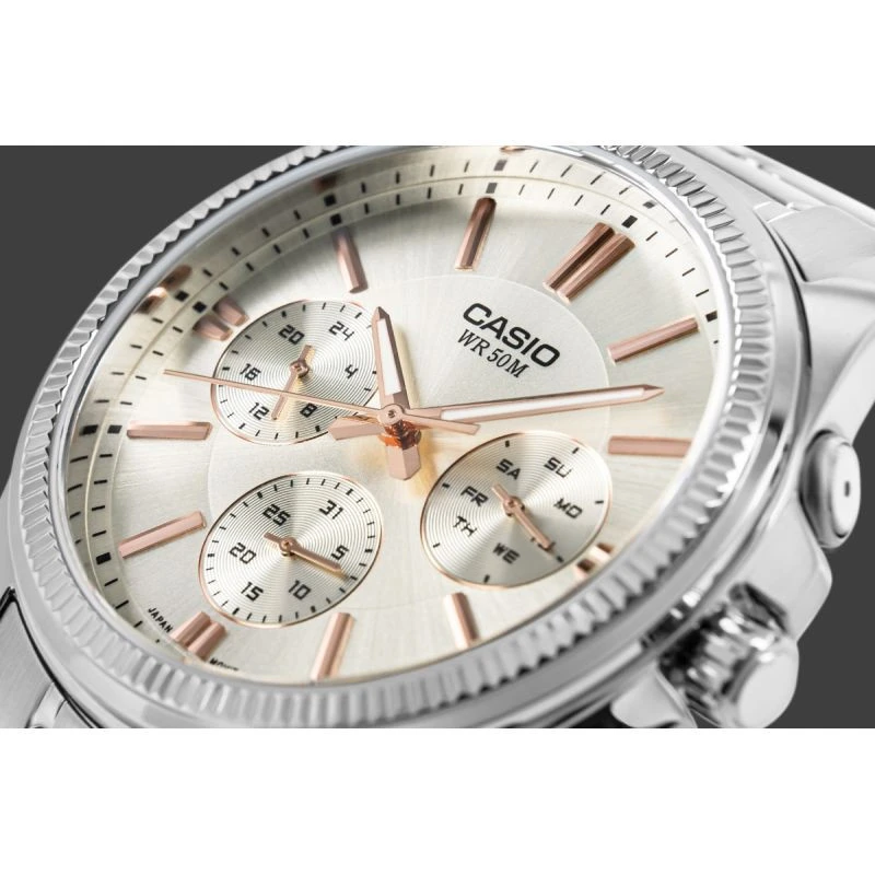 CASIO MTP-1375D-7A2VDF to zegarek dla mężczyzny, który lubi mieć wszystko pod kontrolą – styl, czas i jakość. Klasyczna stalowa konstrukcja z powłoką jonową gwarantuje trwałość i odporność na codzienne wyzwania, a tarcza z eleganckimi srebrnymi akcentami dodaje charakteru każdej stylizacji – od garnituru po jeansy. Subtarcze pokazujące dzień tygodnia, datę i godzinę w trybie 24h dają Ci pełen obraz sytuacji za jednym spojrzeniem, bez sięgania po telefon. Wodoszczelność do 50 metrów i dokładność mechanizmu (±20 sekund/miesiąc) to spokój ducha – nie musisz się martwić o pogodę, przypadkowe zachlapania czy spóźnienia. Całość tworzy wyrazisty, męski styl, który przyciąga spojrzenia i sprawia, że zegarek prezentuje się znacznie powyżej swojej klasy cenowej.