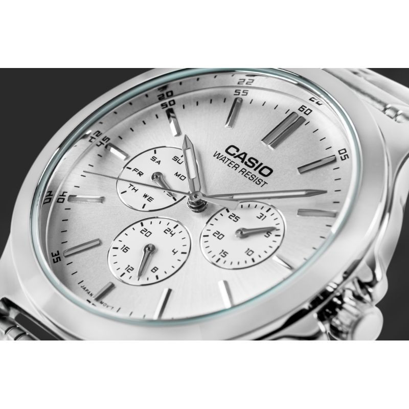 Casio MTP-VD300-7BUDF to zegarek męski o ponadczasowym charakterze, który wyróżnia się elegancką białą tarczą z trzema funkcjonalnymi subtarczami – wskazaniem dnia tygodnia, datownikiem oraz 24-godzinnym czasem. Wytrzymała stalowa koperta w połączeniu z bransoletą tworzą, stylowy zestaw, który sprawdzi się zarówno w codziennym użytkowaniu, jak i w bardziej formalnych okazjach. Mineralne szkiełko zapewnia ochronę przed zarysowaniami, a precyzyjny mechanizm kwarcowy gwarantuje niezawodne działanie. Zegarek posiada standardową odporność na wodę WR, co oznacza, że poradzi sobie z przypadkowymi zachlapaniami. To idealne połączenie prostoty, klasy i praktycznych rozwiązań w przystępnej formie.
