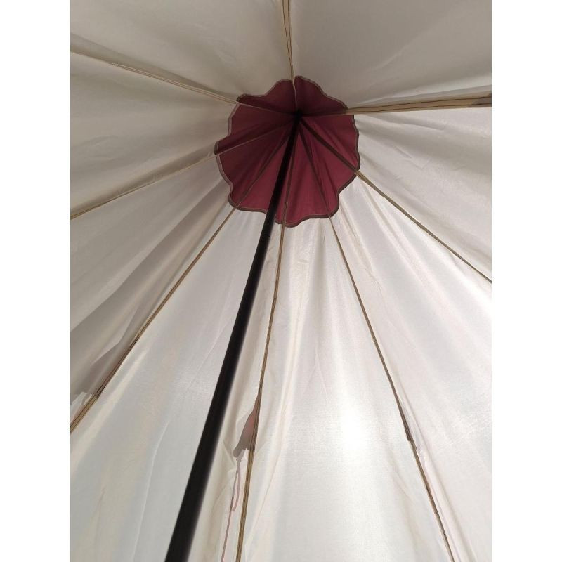 Namiot ma klasyczny kształt tipi, który nie tylko przyciąga wzrok, ale także zapewnia lepszą cyrkulację powietrza i poprawia komfort wewnątrz namiotu, zwłaszcza podczas cieplejszych dni.