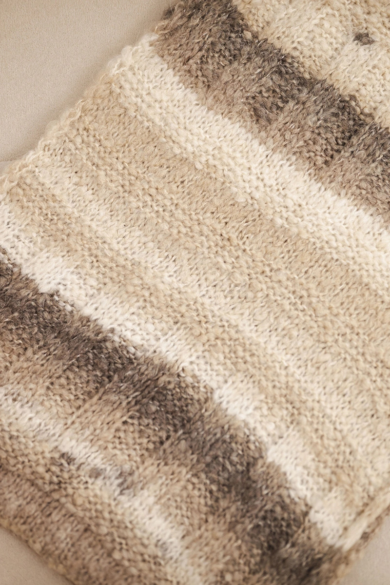 Šátek je dostatečně široký a dlouhý, aby se dal nosit různými způsoby — jako klasický obvaz, volně spuštěný nebo dvakrát obtočený. Hodí se jak k kabátu, tak k péřové bundě.